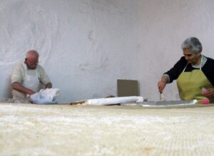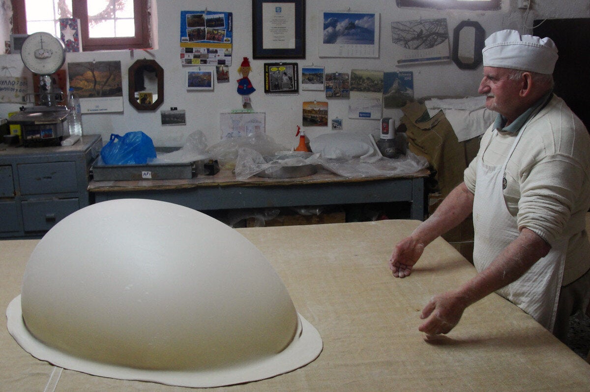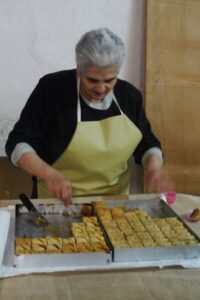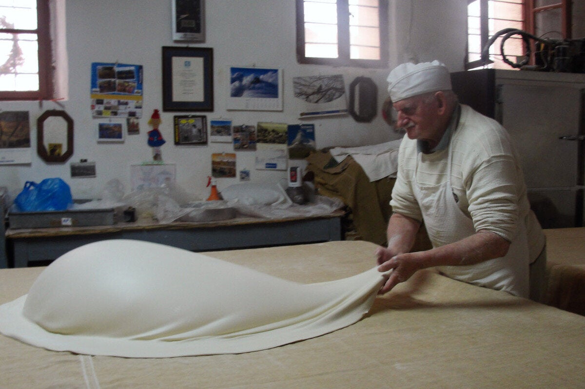 Μία μεγάλη μπάλα ζυμάρι, με μαγικό τρόπο γίνεται ένα λεπτό φύλλο… Με τη μαεστρία του και την αγάπη του! «Όταν αγαπάς αυτό που κάνεις και το ευχαριστιέσαι, τότε σε ανταμείβει» θα μας πει ενώ προετοιμάζει το ζυμάρι. Στριφογυρίζει στα χέρια του μία μεγάλη μπάλα. Η κυρία Κατερίνα, μόλις έχει ψήσει ένα ταψί μπακλαβά και ετοιμάζεται να μας φιλέψει…! Είναι όλα τόσο αυθεντικά εδώ που κατά ένα περίεργο τρόπο νιώθεις ότι τους ξέρεις χρόνια! Νιώθεις άνετα! Δοκιμάζεις το πρώτο κομμάτι μπακλαβά και χωρίς κανέναν ενδοιασμό αισθάνεσαι ότι μπορείς να ζητήσεις και ένα δεύτερο. Και ένα ποτήρι νερό, σε εκείνα τα χαρακτηριστικά του ελληνικού καφενείου.