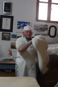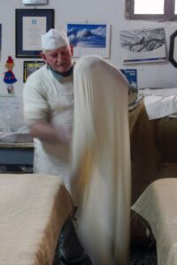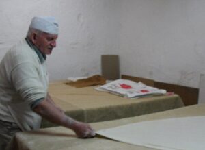 Και ξαφνικά, εκεί που κανείς δεν το περιμένει ο κυρ Γιώργος, κάνει μία απότομη κίνηση, πετάει ψηλά το ζυμάρι και αυτό προσγειώνεται πάνω στο τεράστιο τραπέζι και αρχίζει κάτι μαγικό! Ένας χορός! Και αυτή τη φορά η ντάμα του κυρ Γιώργου, είναι το ίδιο το ζυμάρι. Στην αρχή, δημιουργείται ένα τεράστιο μπαλόνι, και αρχίζει και γυρίζει γύρω – γύρω χορευτικά και απλώνει το ζυμάρι το οποίο με ένα μαγικό τρόπο, μεταλλάσσεται σε φύλλο. Και γίνεται όλο και πιο λεπτό. Και λες τώρα θα σκιστεί… Αλλά αυτό γίνεται όλο και πιο ανθεκτικό! Δεν αντέχεις και θες να το πιάσεις με τα ίδια σου τα χέρια! «Δεν υπάρχει συνταγή. Είναι πολλά που παίζουν ρόλο. Από την υγρασία στην ατμόσφαιρα μέχρι και τη δική μου διάθεση. Άνθρωπος είσαι! Δεν έχεις πάντα την ίδια όρεξη. Ό,τι και να γίνει όμως η ποιότητα του φύλλου θα είναι ίδια. Τη μία θα βάλεις λίγο περισσότερο νερό από την κρήνη, την άλλη θα το δουλέψεις πιο πολύ!» Δεν φτιάχνει όμως μόνο φύλλο. Φτιάχνει και το περίφημο καταϊφι. Στο μέσα δωμάτιο με τη χρήση του κατάλληλου σκεύους ο κυρ Γιώργος φτιάχνει το καλύτερο κανταΐφι που ταξιδεύει με παραγγελιές σε ολόκληρο τον κόσμο.