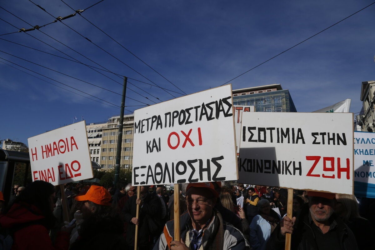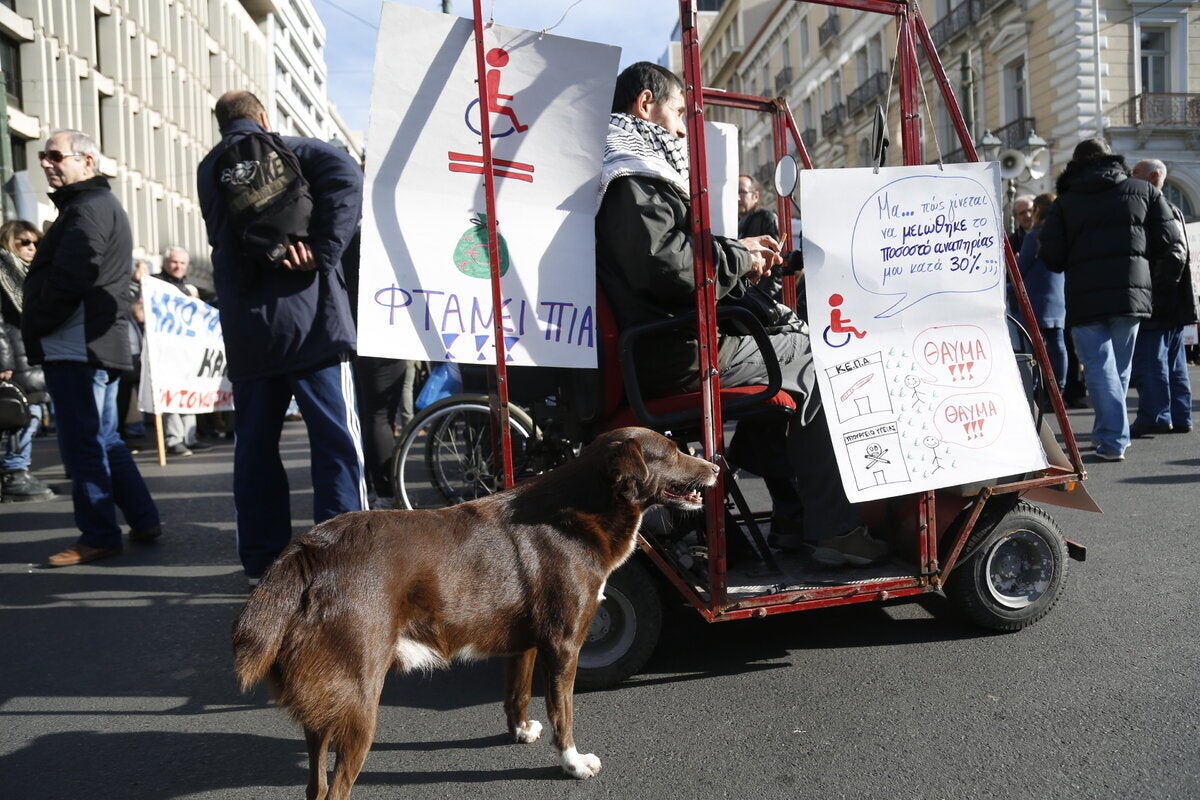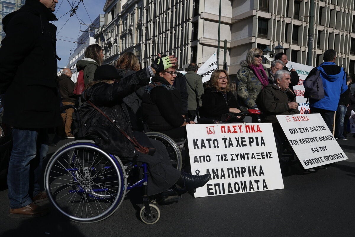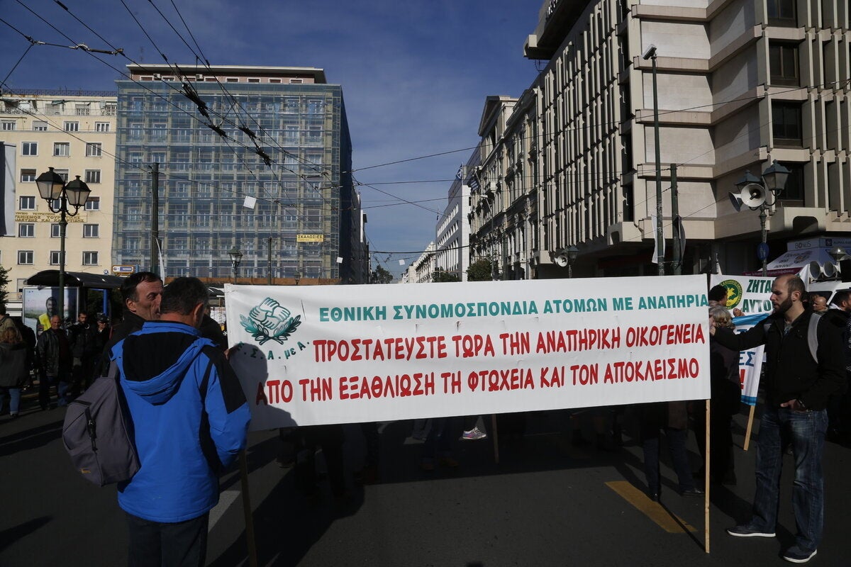 Πανελλαδικό συλλαλητήριο πραγματοποίησαν άτομα με ειδικές ανάγκες στην πλατεία Κλαυθμώνος επ’ ευκαιρία της αυριανής «εθνικής ημέρας ατόμων με αναπηρία». Ο πρόεδρος της ΕΣΑμεΑ (Εθνικής Συνομοσπονδίας Ατόμων με Αναπηρία) Γιάννης Βαερδακαστάνης δήλωσε στο ΑΠΕ-ΜΠΕ ότι «σήμερα στέλνουμε ένα μήνυμα ότι θέλουμε να ζήσουμε στη χώρα μας σε συνθήκες αξιοπρέπειας. Ζητάμε από την κυβέρνηση να διασφαλίσει την αξιοπρέπειά μας, την υγεία, την παιδεία, την πρόνοια, την εργασία, τα εισοδήματά μας. Ο αποκλεισμός, η φτωχοποίηση και οι διακρίσεις κυριεύουν τη ζωή μας.
