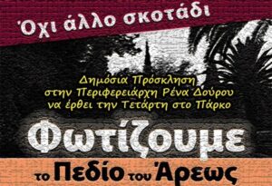 Το 2017 ήταν μία πολύ κακή χρονιά για το Πεδίον του Άρεως. Η εγκληματικότητα από την πιάτσα ναρκωτικών στην Μαυρομματαίων μαζί με την αδιαφορία της Περιφέρειας Αττικής, οδήγησαν το μεγαλύτερο Πάρκο της Αθήνας στην ολοκληρωτική απαξίωσή του. Η απελπιστική κατάσταση όμως γέννησε και μία ελπίδα: για πρώτη φορά μετά την απόπειρα Κυριακού να καταπατήσει ένα κομμάτι του Πάρκου, οι κάτοικοι θύμωσαν, συγκεντρώθηκαν και διεκδίκησαν μαζικά την ανάταξη της κατάστασης με τη δράση «Φωτίζουμε το Πεδίο του Άρεως», μία δράση που απέδειξε ότι οι πολίτες έχουν λόγο και μπορούν να διεκδικήσουν ένα καλύτερο περιβάλλον για τις ζωές τους, όταν εκδηλώνουν το ενδιαφέρον τους, συνειδητοποιούν τη δύναμή τους και γίνονται ενοχλητικοί απέναντι στις (αδιάφορες) Αρχές.