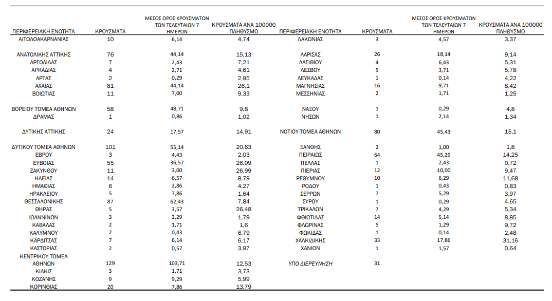 Τέλος, έχουμε 25 νέους θανάτους, φθάνοντας τους 5.903 συνολικά στη χώρα, εκ των οποίων οι 3473 (58,8%) ήταν άνδρες. Η διάμεση ηλικία των θανόντων ήταν τα 79 χρόνια και το 95,6% είχε κάποιο υποκείμενο νόσημα ή και ηλικία 70 ετών και άνω.