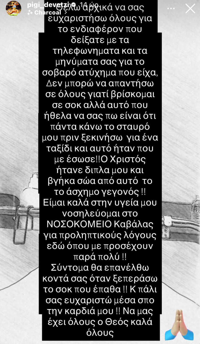 Στην ανάρτησή της έγραψε: «Θέλω αρχικά να σας ευχαριστήσω όλους για το ενδιαφέρον που δείξατε με τα τηλεφωνήματα και τα μηνύματά σας για το σοβαρό ατύχημα που είχα. Δεν μπορώ να απαντήσω σε όλους γιατί βρίσκομαι σε σοκ, αλλά αυτό που ήθελα να σας πω είναι ότι πάντα κάνω τον σταυρό μου πριν ξεκινήσω ένα ταξίδι και αυτό ήταν που με έσωσε. Ο Χριστός ήταν δίπλα μου και βγήκα σώα από αυτό το άσχημο γεγονός. Είμαι καλά στην υγεία μου, νοσηλεύομαι στο νοσοκομείο Καβάλας για προληπτικούς λόγους, εδώ όπου με προσέχουν πάρα πολύ».