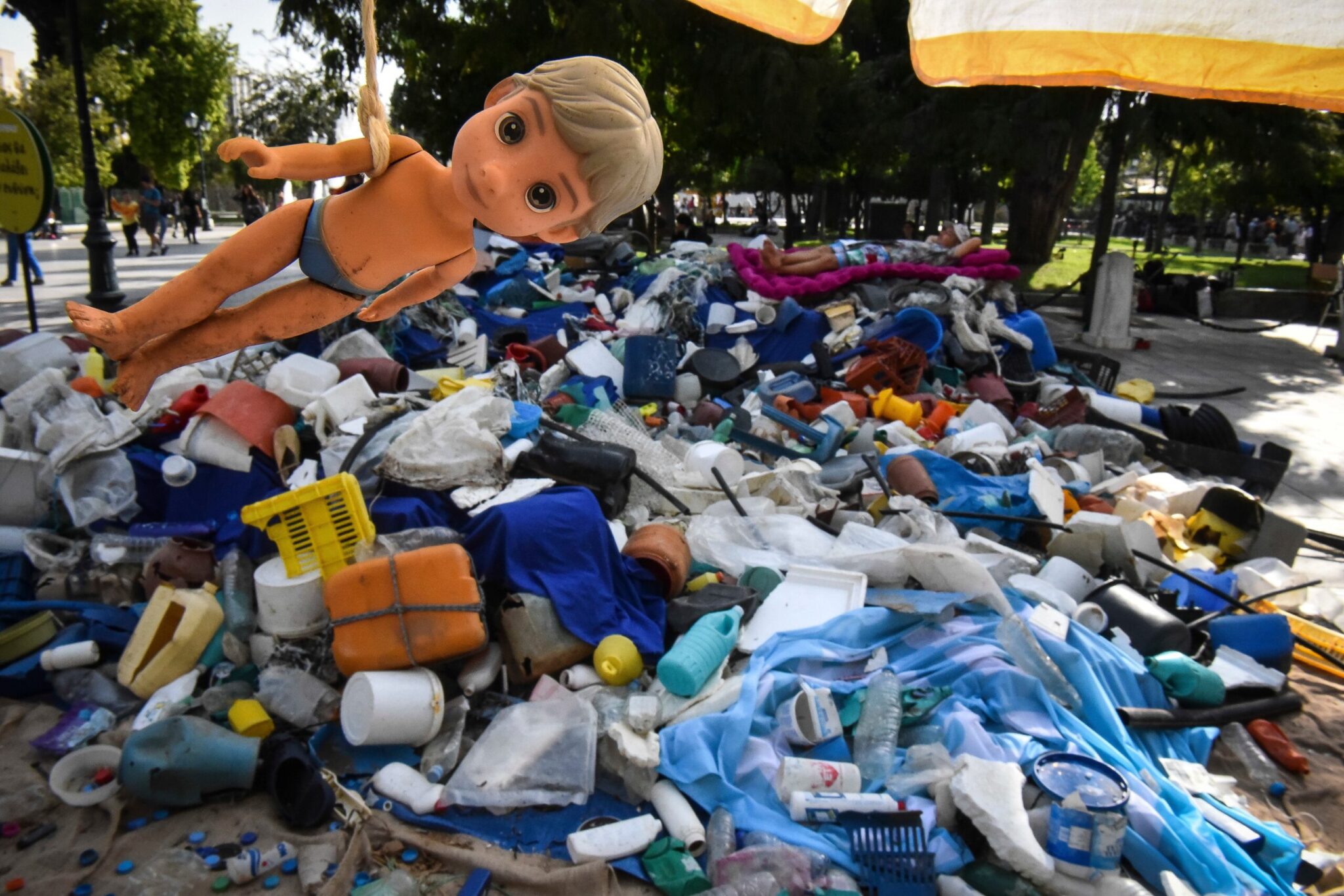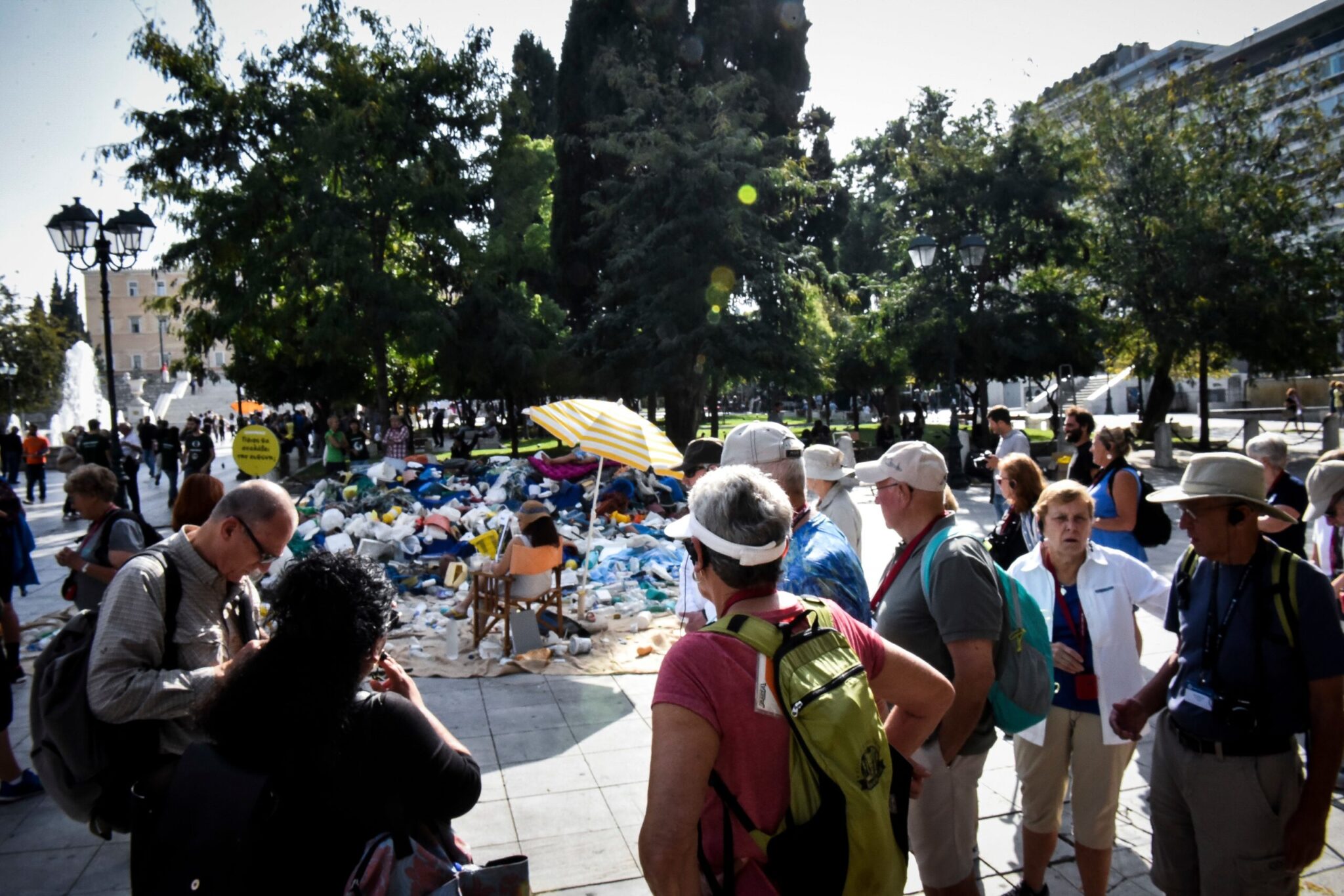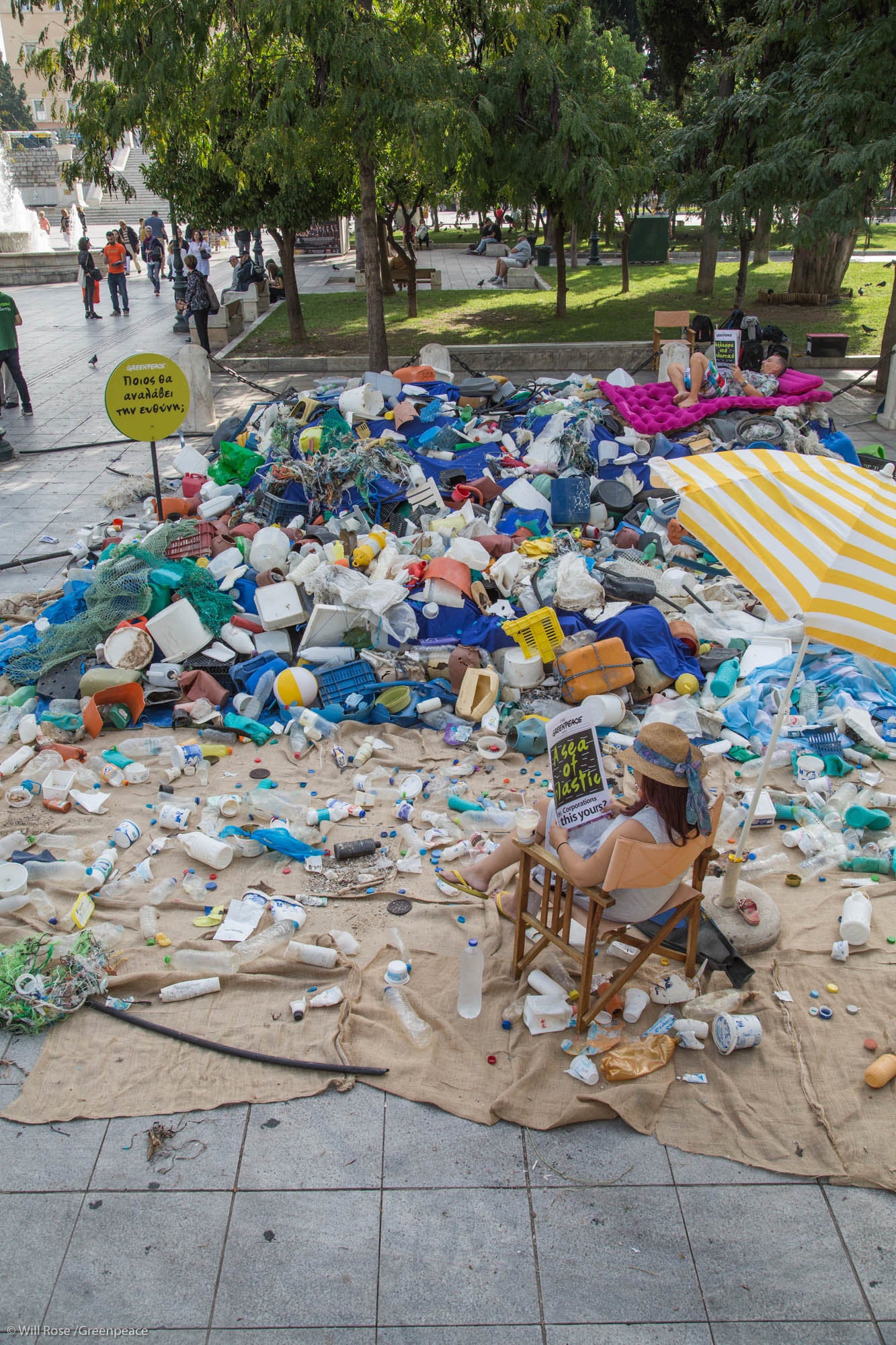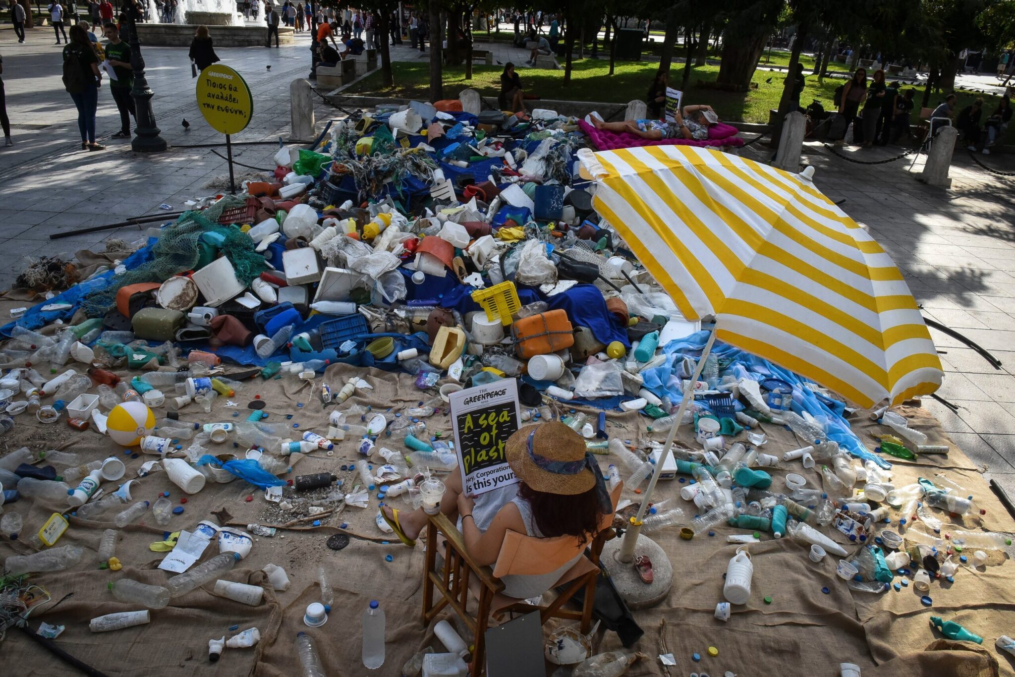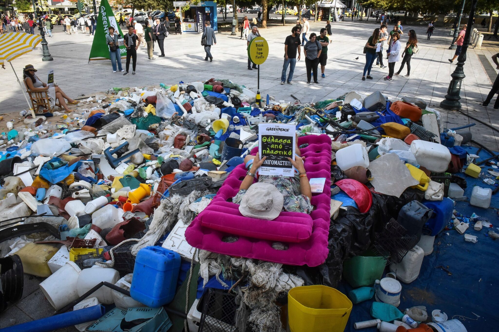 Ακτιβιστές της Greenpeace δημιούργησαν στην πλατεία Συντάγματος μία θάλασσα πλαστικού με τα απορρίμματα που συνέλεξαν στην παραλία Χάρακα της ανατολικής Εύβοιας. Η πλειονότητα του πλαστικού μίας χρήσης, που εμφανώς προερχόταν από την ανοιχτή θάλασσα, ήταν συσκευασίες για ροφήματα, νερό και φαγητό που ανήκουν σε γνωστές εταιρείες παραγωγής καταναλωτικών αγαθών.
