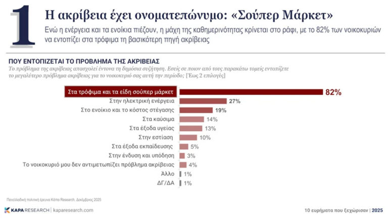 Ενώ η ενέργεια και τα ενοίκια πιέζουν, η μάχη της καθημερινότητας κρίνεται στο ράφι, με το 82% των νοικοκυριών να εντοπίζει στα τρόφιμα τη βασικότερη πηγή της ακρίβειας.