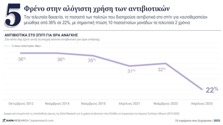 Την τελευταία δεκαετία το ποσοστό των πολιτών που διατηρούσε αντιβιοτικά στο σπίτι για «αυτοθεραπεία» μειώθηκε από 36% σε 22%, με σημαντική πτώση 10 ποσοστιαίων μονάδων τα τελευταία δύο χρόνια.