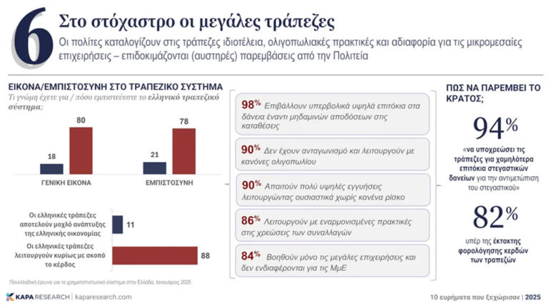 Οι πολίτες καταλογίζουν στις τράπεζες ιδιοτέλεια, ολιγοπωλιακές πρακτικές και αδιαφορία για τις μικρομεσαίες επιχειρήσεις – επιδοκιμάζονται (αυστηρές) παρεμβάσεις από την Πολιτεία.