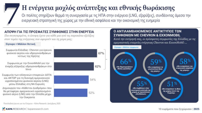 Οι πολίτες στηρίζουν θερμά τη συνεργασία με τις ΗΠΑ στην ενέργεια (LNG, εξορύξεις), συνδέοντας άμεσα την ενεργειακή στρατηγική της χώρας με την εθνική ασφάλεια και την οικονομική ευημερία.