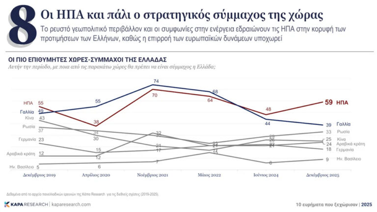 Το ρευστό γεωπολιτικό περιβάλλον και οι συμφωνίες στην ενέργεια εδραιώνουν τις ΗΠΑ στην κορυφή των προτιμήσεων των Ελλήνων, καθώς η επιρροή των ευρωπαϊκών δυνάμεων υποχωρεί.