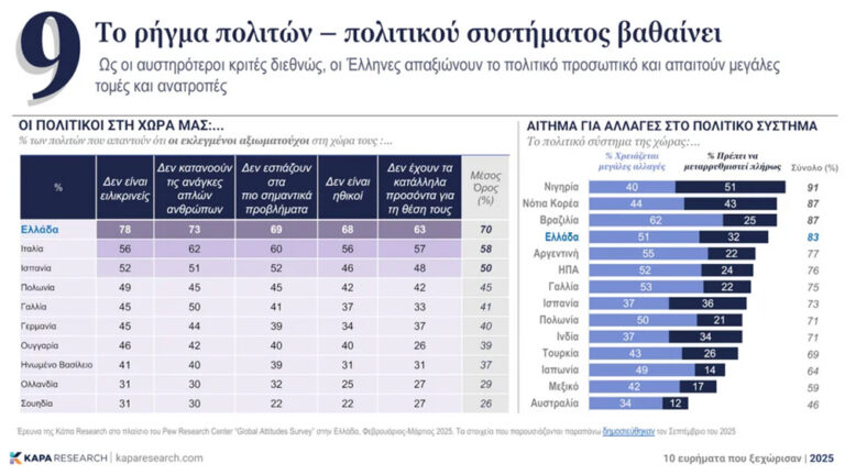 Ως οι αυστηρότεροι κριτές διεθνώς, οι Έλληνες απαξιώνουν το πολιτικό προσωπικό και απαιτούν μεγάλες τομές και ανατροπές.