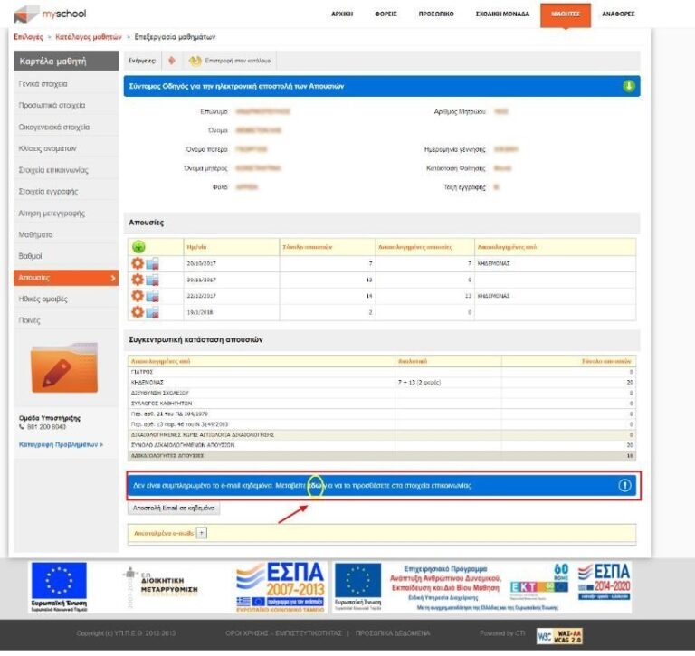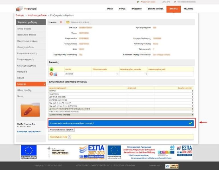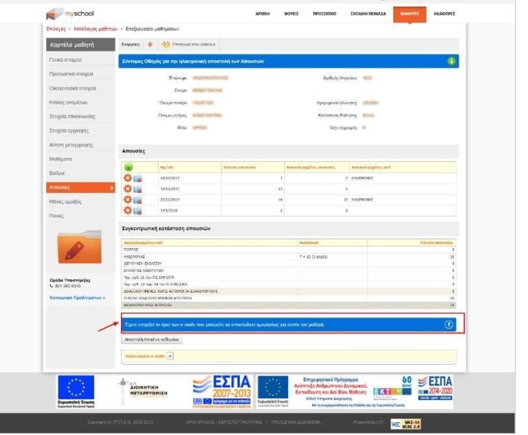 Στον φάκελο του μαθητή, στην καρτέλα «Απουσίες», έχει προστεθεί μία νέα λειτουργικότητα η οποία επιτρέπει στον χρήστη να στείλει με email το σύνολο των απουσιών του μαθητή. Το email στο οποίο γίνεται η αποστολή αντλείται από τα στοιχεία κηδεμόνα που έχουν δηλωθεί στην καρτέλα «Στοιχεία Επικοινωνίας». Όταν δεν έχει δηλωθεί email κηδεμόνα, τότε εμφανίζεται σχετικό μήνυμα με παραπομπή στην αντίστοιχη καρτέλα του μαθητή.