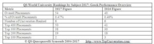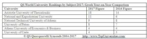 Στους Διεθνείς Πίνακες Κατάταξης Πανεπιστημίων διακρίνονται συνολικά 6 ελληνικά πανεπιστήμια με το Αριστοτέλειο Πανεπιστήμιο Θεσσαλονίκης, να παραμένει το κορυφαίο πανεπιστήμιο στην Ελλάδα, το οποίο διακρίνεται σε 18 ειδικότητες (από 14 το 2016). Φέτος για πρώτη φορά το Αριστοτέλειο Πανεπιστήμιο Θεσσαλονίκης συγκαταλέγεται και σε 5 νέες ειδικότητες. Στην ειδικότητα των Επιστημών Βιολογίας κατατάσσεται στην 351-400 θέση, στην είδικότητα της Οικονομίας και Οικονομετρίας κατατάσσεται στη 251-300 θέση, στην ειδικότητα των Χημικών Μηχανικών κατατάσσεται στη 201-250, στην ειδικότητα της Νομικής κατατάσσεται στη 251-300 θέση, και στην ειδικότητα της Φαρμακευτικής και Φαρμακολογίας κατατάσσεται στη 201-250 θέση.