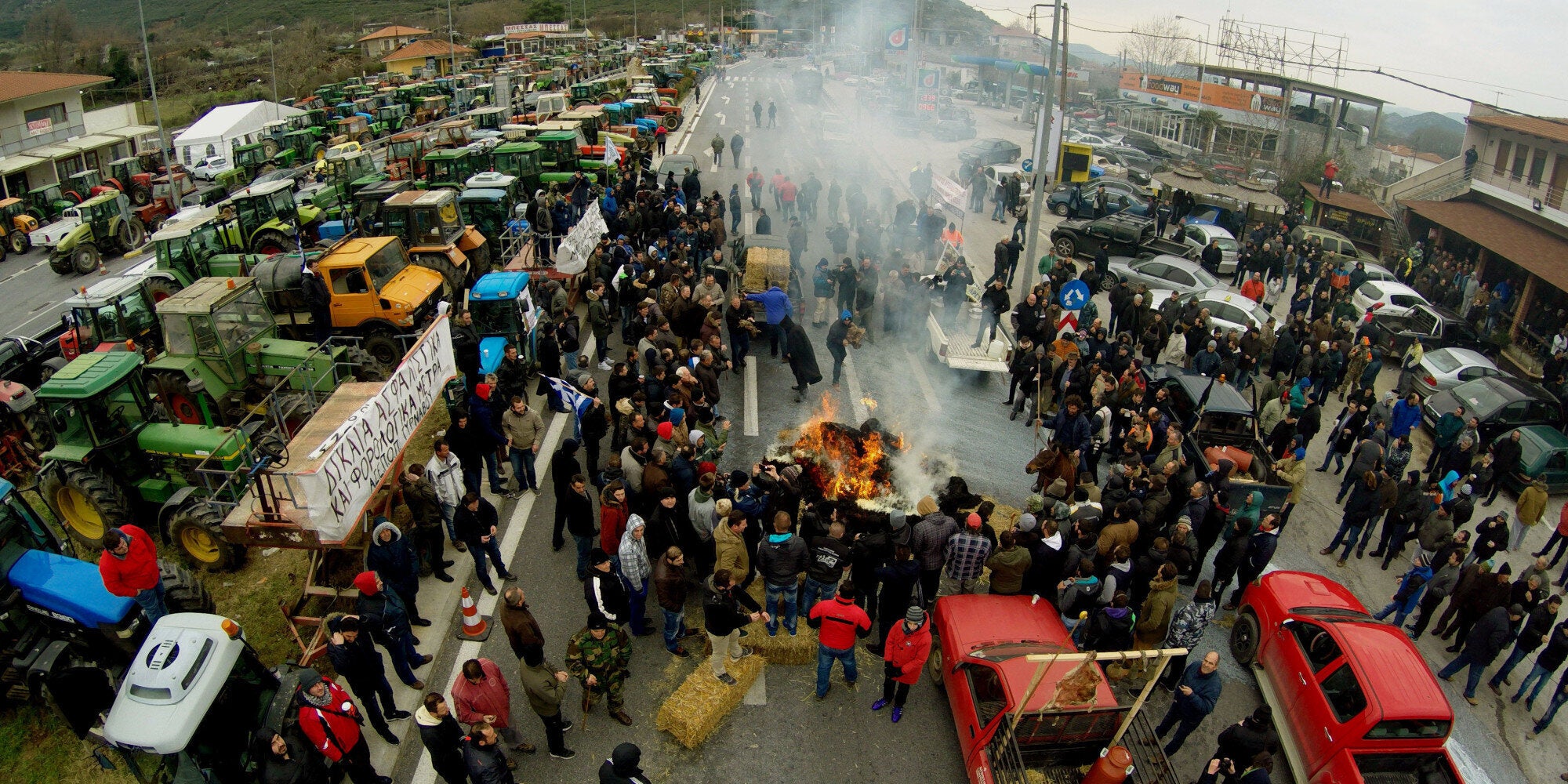 Σε τρία ανέρχονται πλέον τα μπλόκα που έχουν στηθεί στο Νομό Δράμας. Στη διασταύρωση Κοκκινογείων Προσοτσάνης Δράμας, στο δρόμο προς το τελωνείο της Εξοχής, στα σύνορα της Ελλάδας με τη Βουλγαρία, περισσότερα από 600 τρακτέρ καταλαμβάνουν συμβολικά το οδόστρωμα.