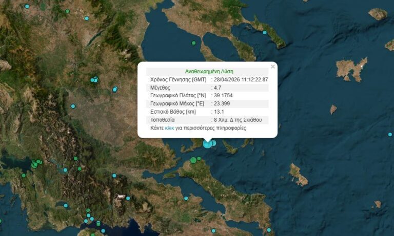 Ισχυρός σεισμός 4,7 Ρίχτερ εκδηλώθηκε το μεσημέρι της Τρίτης (28/4) στην Σκιάθο με εστιακό βάθος τα 13 χιλιόμετρα.