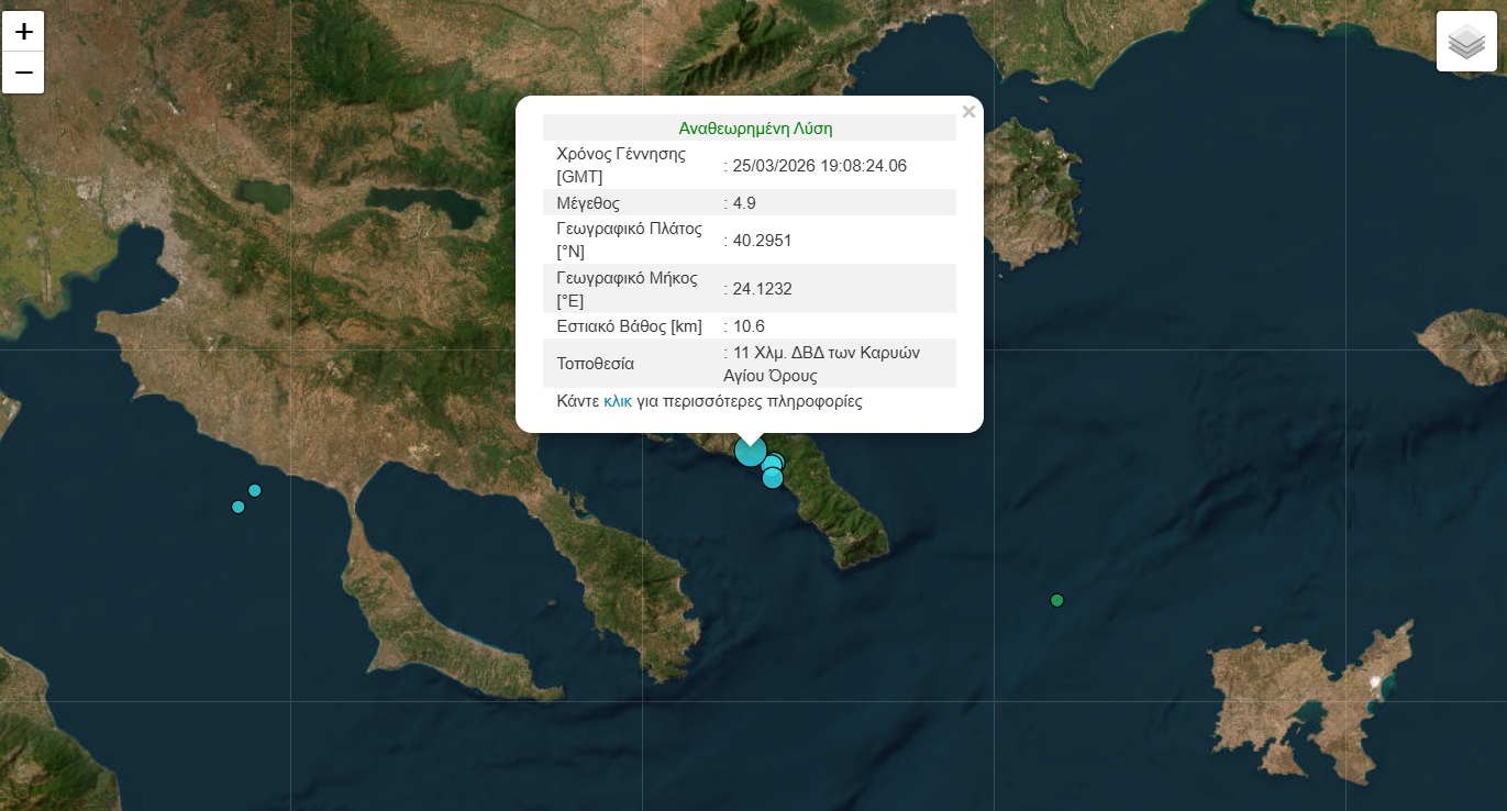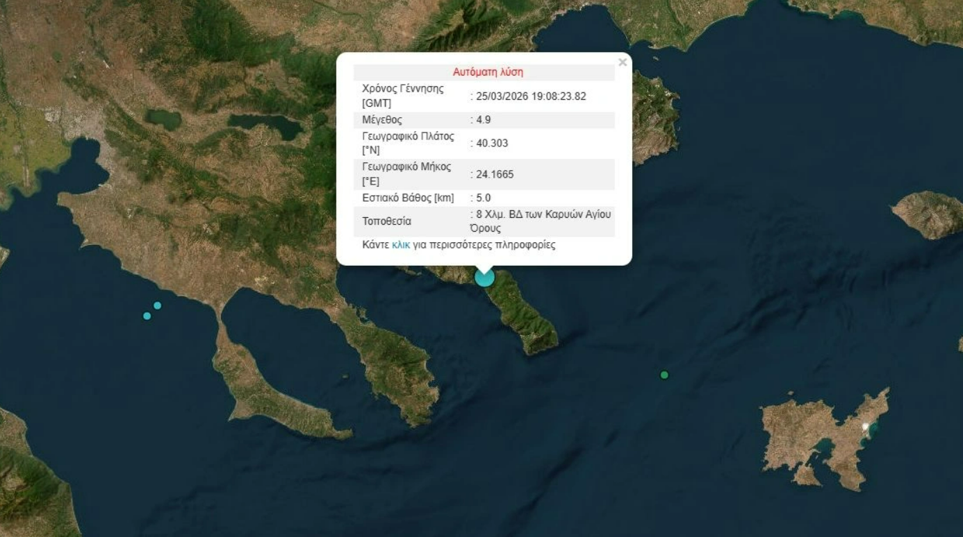 Σεισμός 4,9 Ρίχτερ σημειώθηκε το βράδυ της Τετάρτης (25/3) στο Άγιο Όρος, ενώ λίγα λεπτά μετά σημειώθηκαν μετασεισμοί 2,8 και 3,3 Ρίχτερ αντίστοιχα.