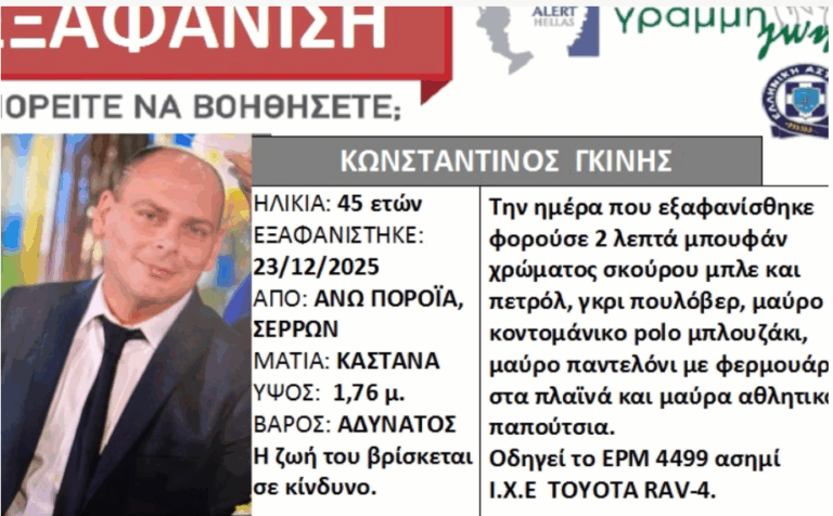 Υπενθυμίζεται ότι ο 45χρονος έφυγε από το σπίτι του, στο οποίο διαμένει με τη σύζυγο του και τα δύο παιδιά του, προς άγνωστη κατεύθυνση χωρίς το κινητό του και τραπεζικές κάρτες, ενώ φορούσε στο χέρι του ένα smartwatch, το οποίο ίσως βοηθήσει στις έρευνες για τον εντοπισμό του.