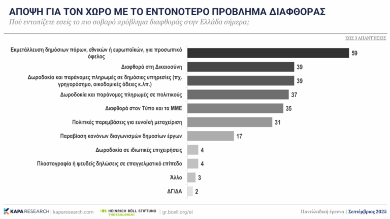 Όσον αφορά, δε, στους χώρους που κυριαρχεί η διαφθορά, την πρώτη θέση καταλαμβάνει η εκμετάλλευση εθνικών ή ευρωπαϊκών πόρων (59%) για προσωπικό όφελος και ακολουθούν η Δικαιοσύνη και τα διάφορα «γρηγορόσημα» (από 39%), η διαφθορά των πολιτικών (37%), η διαπλοκή στα ΜΜΕ (35%) και τα πολιτικά ρουσφέτια (31%).