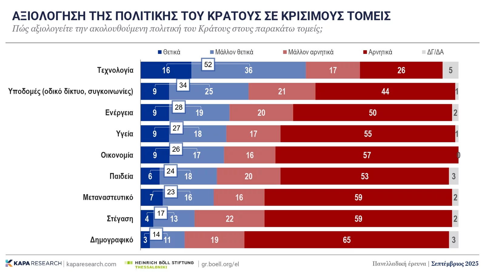 Επίσης πολύ αρνητικά αξιολογείται η πολιτική του κράτους σε μια σειρά από κρίσιμους τομείς όπως οι υποδομές, η ενέργεια, η υγεία, η οικονομία, η παιδεία, το μεταναστευτικό, η στέγαση και το δημογραφικό – μόνη εξαίρεση με πάνω από 50% η τεχνολογία. Ωστόσο υπάρχουν πολύ μεγάλες και διακριτές διαφορές ανάλογα με την οικονομική κατάσταση, την κοινωνική τάξη και την ιδεολογική τοποθέτησή τους.