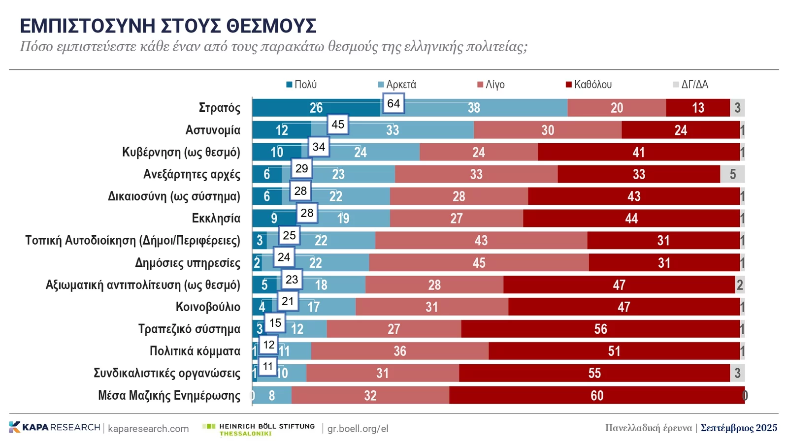 Την ίδια ώρα η εμπιστοσύνη των πολιτών στους θεσμούς βρίσκεται στο «ναδίρ»: Το 92% δηλώνει ότι δεν εμπιστεύεται τα ΜΜΕ, το 81% τα εργατικά συνδικάτα, το 86% τα πολιτικά κόμματα, το 71% τη Δικαιοσύνη, το 65% την κυβέρνηση, το 73% την Εκκλησία, το 66% τις Ανεξάρτητες Αρχές. Μόνο ο στρατός διασώζεται, καθώς το 64% δηλώνει ότι τον εμπιστεύεται.