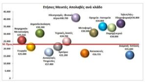 ΣΗΜΕΙΩΣΗ: Τα ποσά αφορούν μεικτές ετήσιες απολαβές. Το μέσο όρο των €22,500 ετησίως αντιστοιχεί σε κάτι λιγότερο από €1.000 καθαρές μηνιαίες απολαβές.