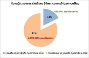 Παρατηρούμε ότι με βάση το μέσο όρο της Ευρώπης, μόλις 620 χιλιάδες εργαζόμενοι σε σύνολο 3,5 εκατομμυρίων (=18%) απασχολούνται σε κλάδους υψηλότερης προστιθέμενης αξίας ανά απασχολούμενο.