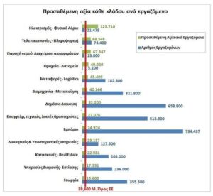 Το παρακάτω γράφημα παρουσιάζει τον αριθμό εργαζομένων ανά κλάδο και τη προστιθέμενη αξία ανά εργαζόμενο που δημιουργεί κάθε κλάδος.