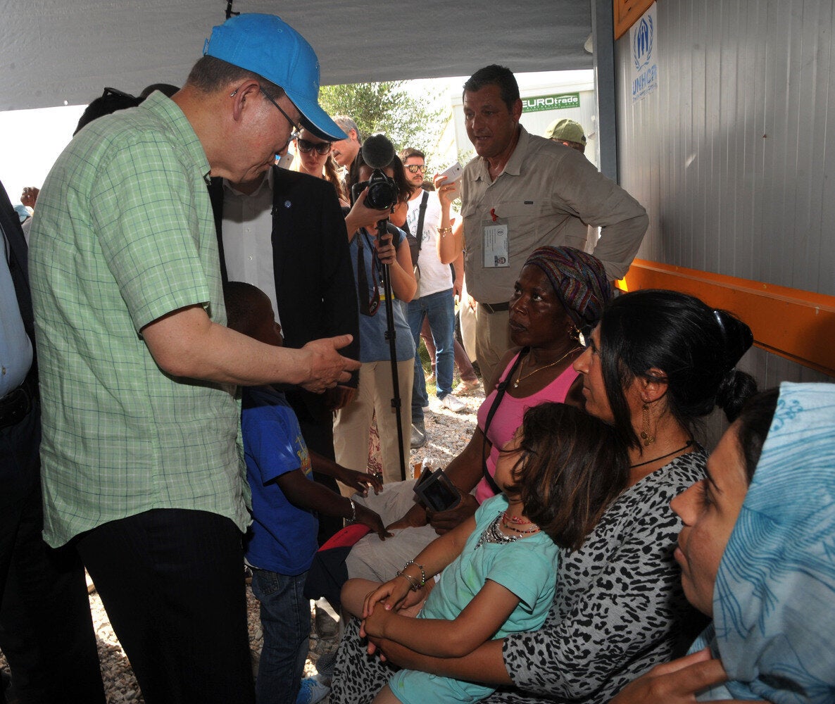 Στη Λέσβο κατέφτασε λίγο μετά τις 2 το μεσημέρι του Σαββάτου ο Γενικός Γραμματέας του ΟΗΕ, Μπαν Κι Μουν.