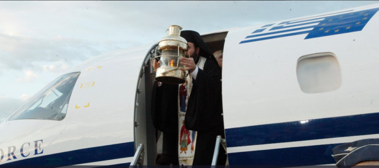 Το κυβερνητικό αεροσκάφος που μετέφερε από τα Ιεροσόλυμα την αποστολή της ελληνικής πολιτείας με το Αγιο Φως προσγειώθηκε στο στρατιωτικό αεροδρόμιο της Ελευσίνας, την 112η Πτέρυγα Μάχης της Πολεμικής Αεροπορίας, στις 8.15 μ.μ., με καθυστέρηση μεγαλύτερη της μίας ώρας.