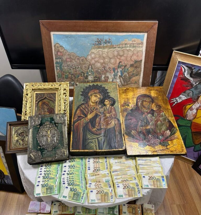 Κατά την επιχείρηση της αστυνομίας βρέθηκαν και κατασχέθηκαν 190.000 ευρώ, καθώς και περισσότερα από 300 έργα, που σύμφωνα με την πρώτη αξιολόγηση από τους ειδικούς, είναι όλα πλαστά, με εξαίρεση 7, τα οποία εκτιμάται πως είναι γνήσια.