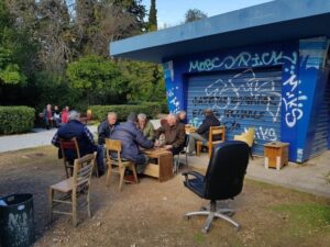 Μετά από μία μεγάλη βόλτα στο γιουσουρούμ που έχει στηθεί για τα Χριστούγεννα στο Πεδίο του Άρεως, συναντάω τον Κώστα στην κεντρική είσοδο του Πάρκου, στο άγαλμα του Κωνσταντίνου. Κάθεται σε ένα τελάρο με τον χαριτωμένο «Κοκό» στην αγκαλιά του και ένα άδειο πλαστικό ποτήρι για όποιον έχει διάθεση να ρίξει μερικά ψιλά. Του λέω «είσαι η πιο αντιπροσωπευτική εικόνα που είδα στη βόλτα μου». Μου σκάει ένα χαμόγελο, αποκαλύπτοντας τα σαπισμένα δόντια του… «Να σε βγάλω μία φωτογραφία;». «Και δεν με βγάζεις…». «Ναι, αλλά χαμογέλα λίγο στο φακό». «Όχι, φαίνονται τα δόντια μου…».