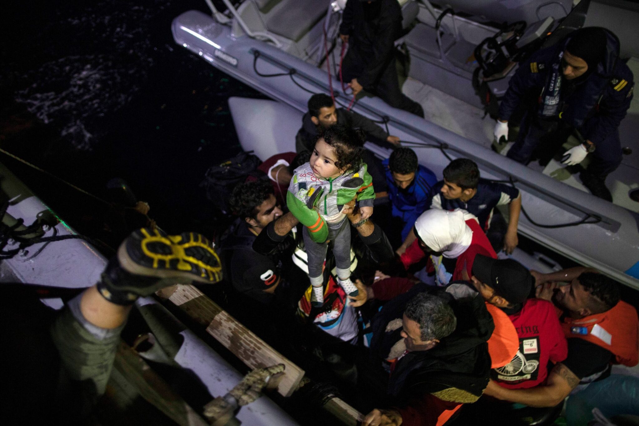 Πρόσφυγες και μετανάστες μεταφέρονται από το φουσκωτό σκάφος τους σε πλοιάριο της ελληνικής ακτοφυλακής, κατά τη διάρκεια μιας επιχείρησης διάσωσης κοντά στο νησί της Σάμου. ASSOCIATED PRESS