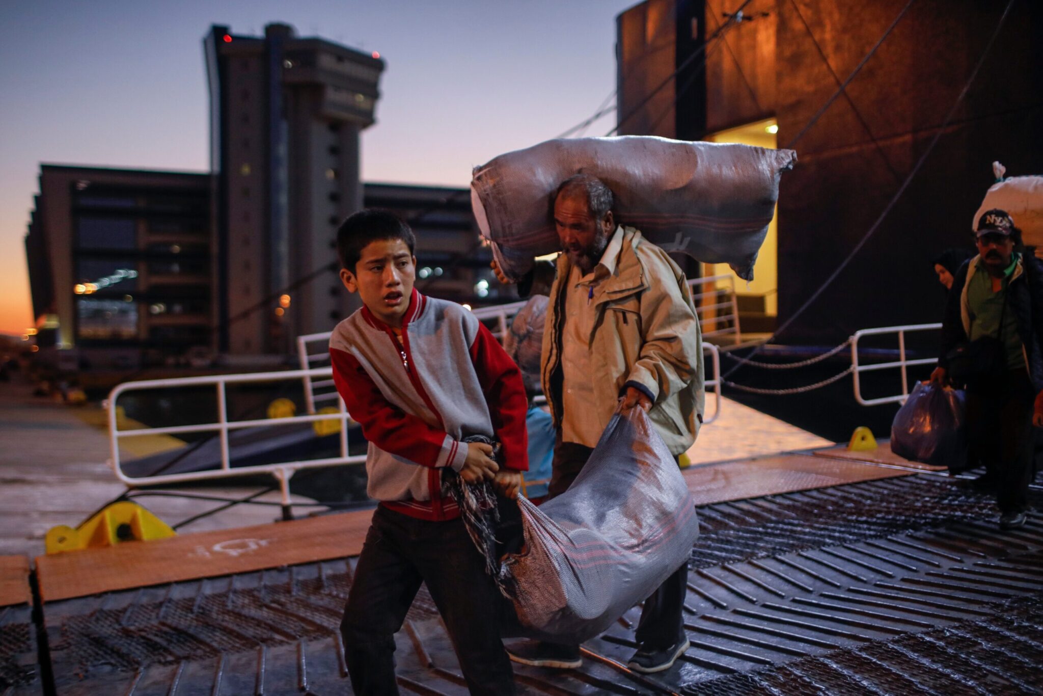 Μετανάστες και πρόσφυγες κουβαλούν τα υπάρχοντά τους, καθώς αποβιβάζονται από ένα πλοίο στο λιμάνι του Πειραιά. Οι ελληνικές αρχές έχουν επιταχύνει τις προσπάθειές τους για την μετακίνηση χιλιάδων μεταναστών από την συνωστισμένη Μόρια στην ηπειρωτική χώρα. ASSOCIATED PRESS