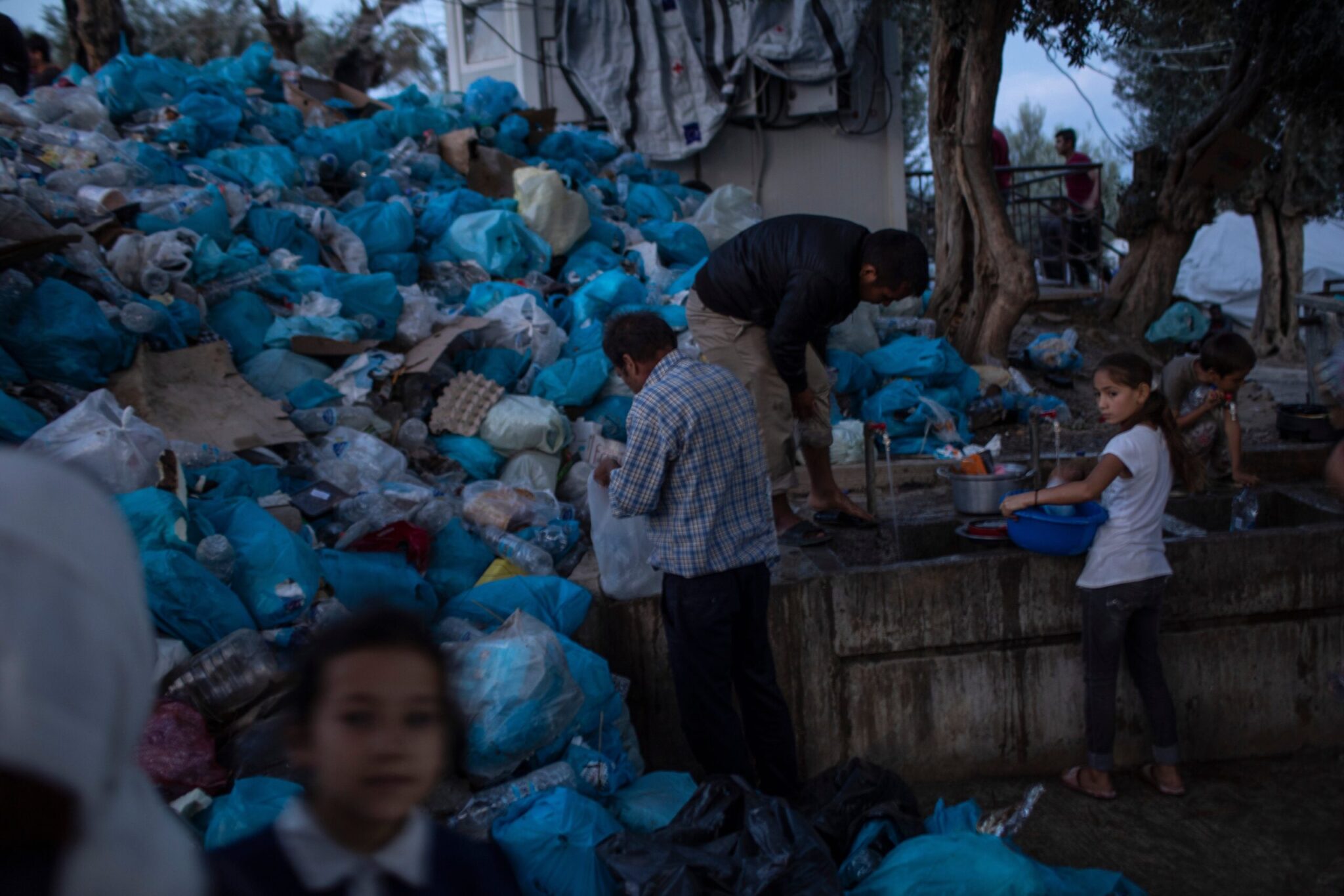 Ανθρωποι πλένονται μπροστά από ένα σωρό σκουπιδιών, σε ένα αυτοσχέδιο καταυλισμό δίπλα στο υπερπλήρες κέντρο της Μόριας. ASSOCIATED PRESS