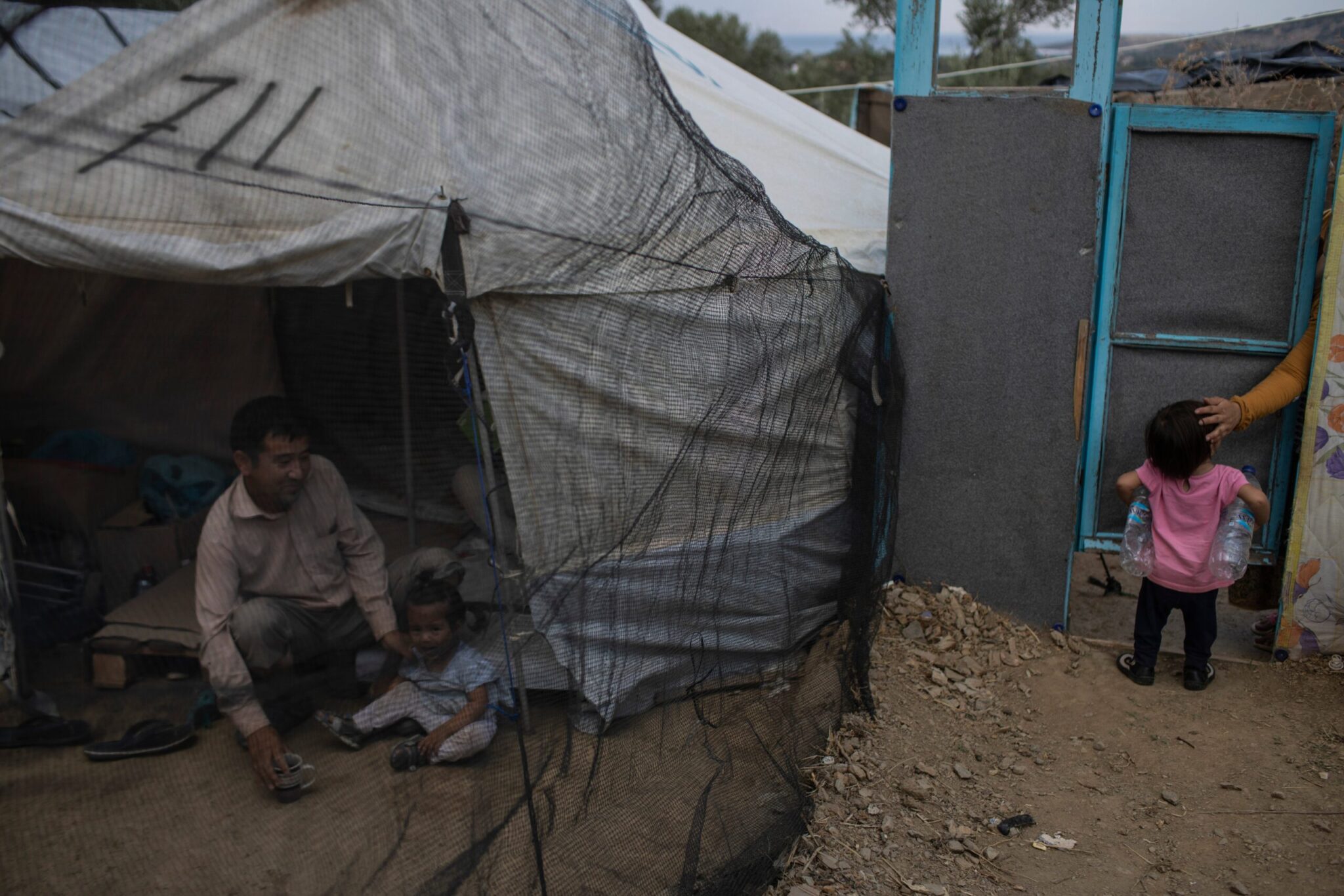 Ο 38χρονος Αμπντούλ Ανόι από το Αφγανιστάν κάθεται δίπλα στην κόρη του, Γέσνα, έξω από τη σκηνή τους στη Μόρια. ASSOCIATED PRESS
