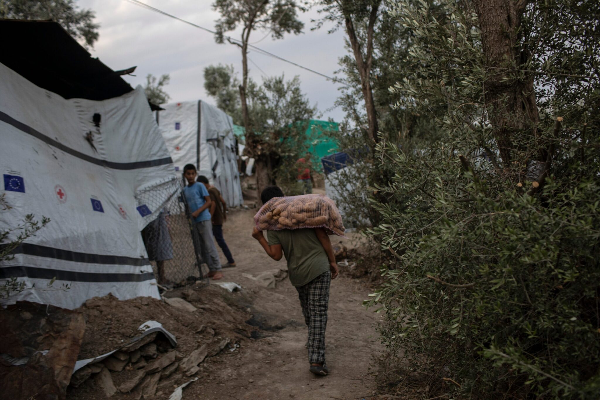 Προσφυγόπουλο από το Αφγανιστάν κουβαλάει στην πλάτη του ένα σακί με πατάτες, στη Μόρια της Λέσβου. ASSOCIATED PRESS