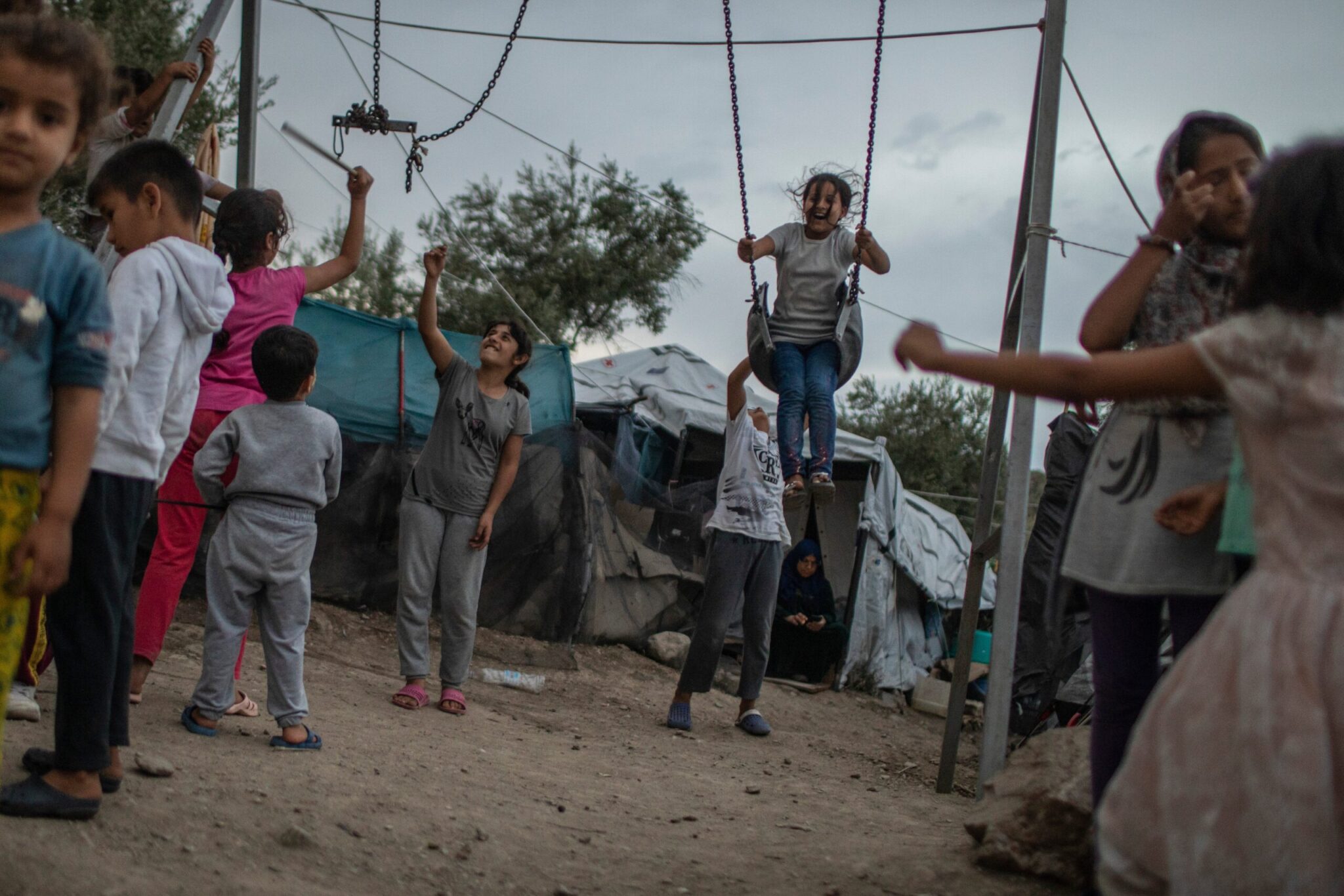 Μικρά παιδιά παίζουν στις κούνιες της Μόριας. ASSOCIATED PRESS