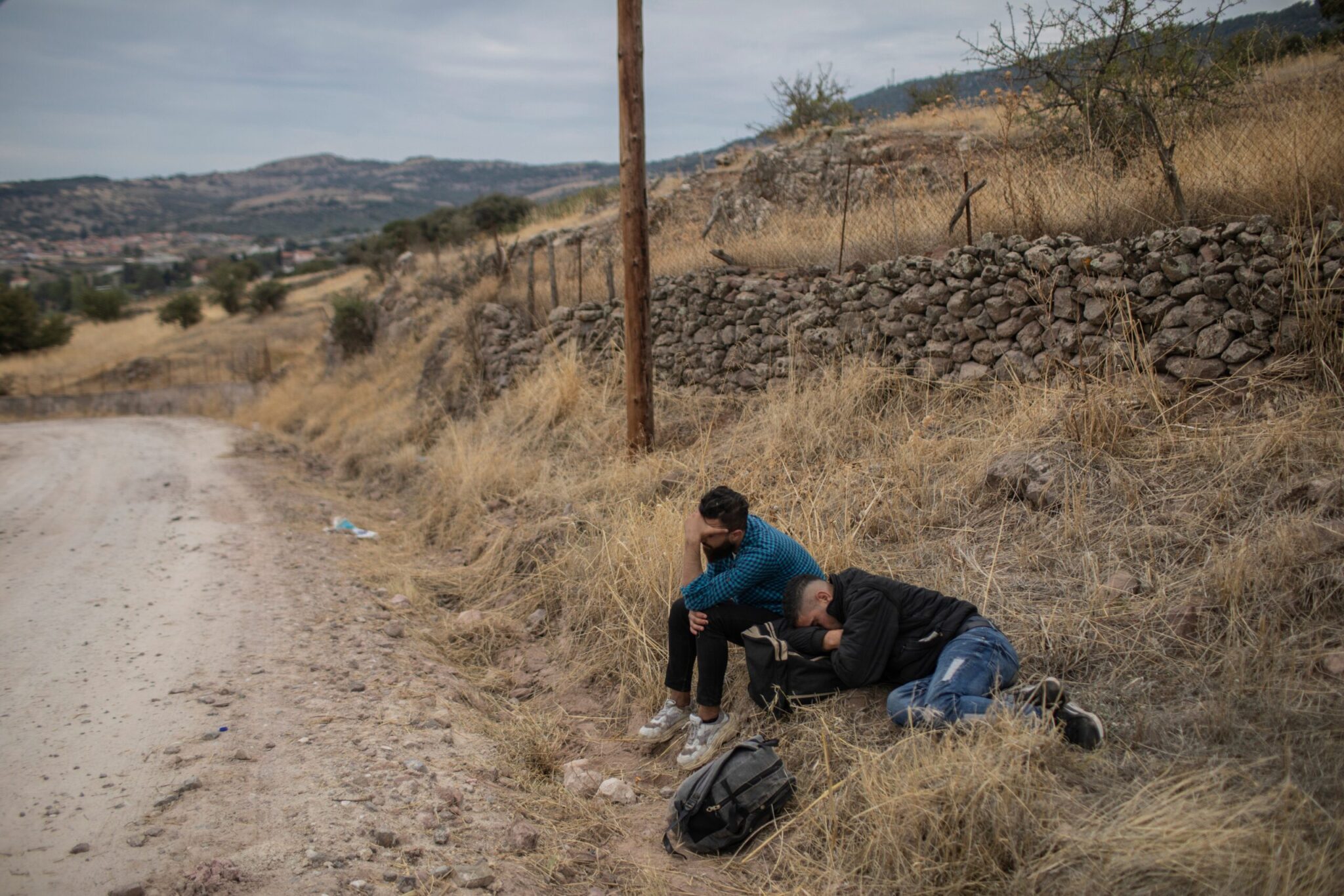 Εξαντλημένοι άνδρες κοιμούνται κοντά στην πόλη του Μανταμάδου, μετά την άφιξή τους με άλλους μετανάστες και πρόσφυγες με πλαστική βάρκα από την Τουρκία στη Λέσβο. ASSOCIATED PRESS