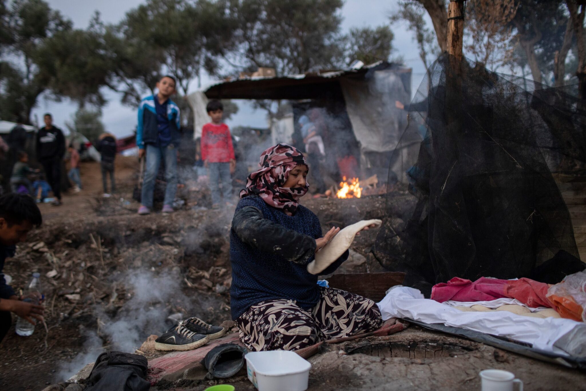 Η Παργκούλ Ραχμάνι, 57 ετών, φτιάχνει ψωμί σε ένα αυτοσχέδιο «αρτοποιείο» στη Μόρια. ASSOCIATED PRESS