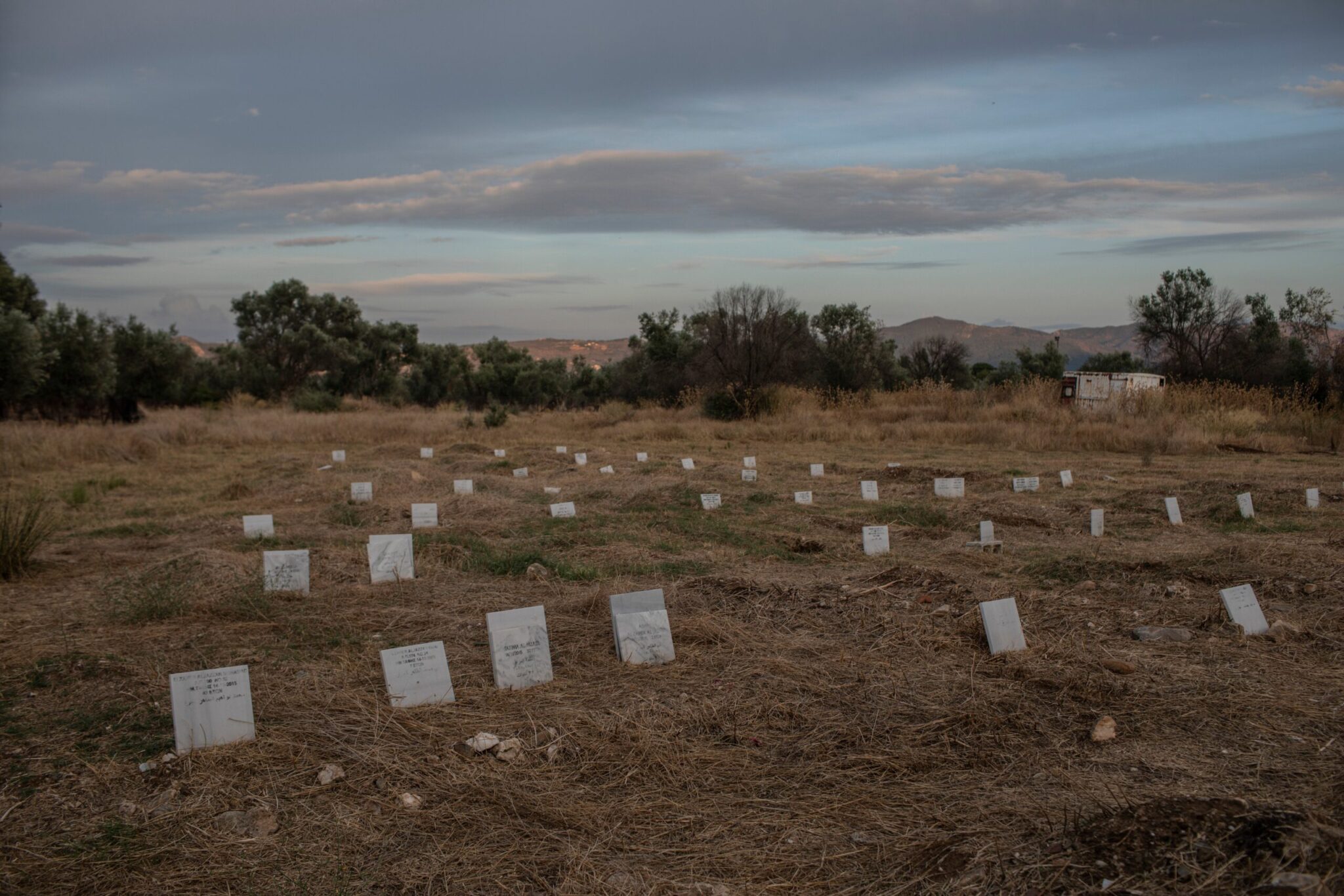 Επιτύμβιες στήλες πάνω από τους τάφους μεταναστών και προσφύγων που πνίγηκαν στη θάλασσα κατά τη διέλευση τους από την Τουρκία στην Ελλάδα, σε ένα άτυπο νεκροταφείο κοντά στο χωριό Κάτω Τρίτος στη Λέσβο. ASSOCIATED PRESS