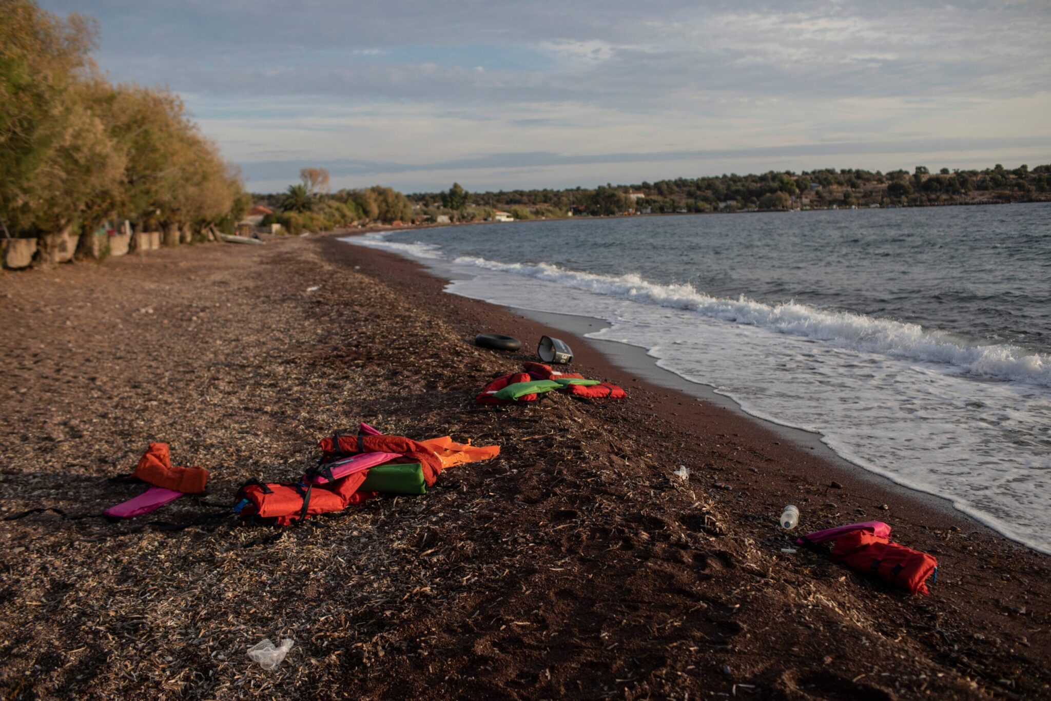 Σωσίβια γιλέκα προσφύγων και μεταναστών στην παραλία του παραθαλάσσιου χωριού Τσόνια της Λέσβου. ASSOCIATED PRESS