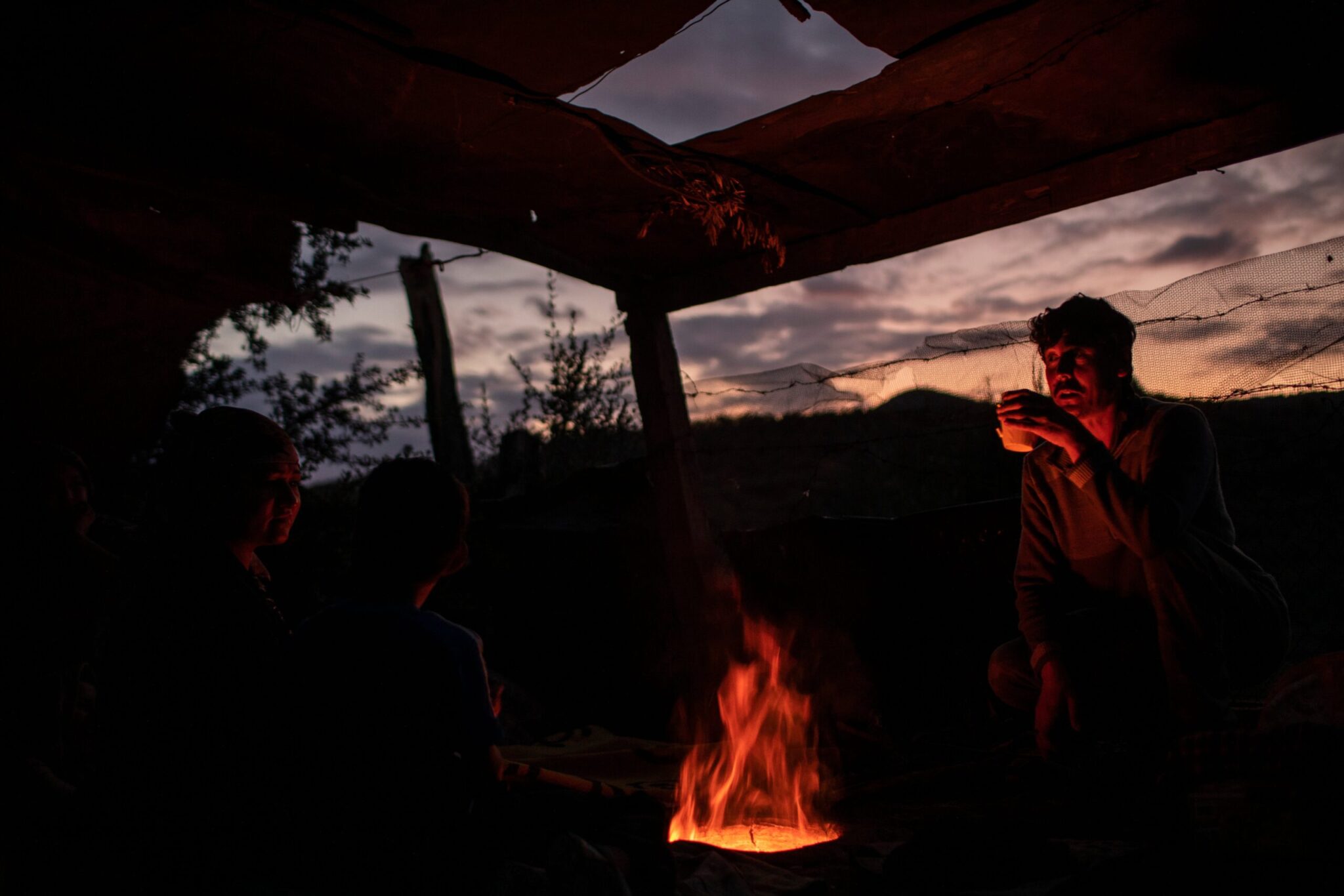 Ανθρωποι από το Αφγανιστάν πίνουν τσάι πάνω από τη φωτιά ενός αυτοσχέδιου μαγκαλιού στη Μόρια. ASSOCIATED PRESS