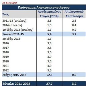 ΣΗΜ: Εκκρεμεί η είσπραξη συνολικού ύψους €3 δισ. ευρώ από τις ολοκληρωμένες συμφωνίες που όμως έχουν «παγώσει» το τελευταίο διάστημα: Περιφερειακά Αεροδρόμια 1,2 δισ. ευρώ, Ελληνικό 0,9 δισ. ευρώ, Αστέρας Βουλιαγμένης 0,4 δισ. ευρώ, Διάφορα Ακίνητα 0,3 δισ. ευρώ. Επίσης το υπόλοιπο 50% από το ψηφιακό μέρισμα (0,2 δισ. ευρώ).