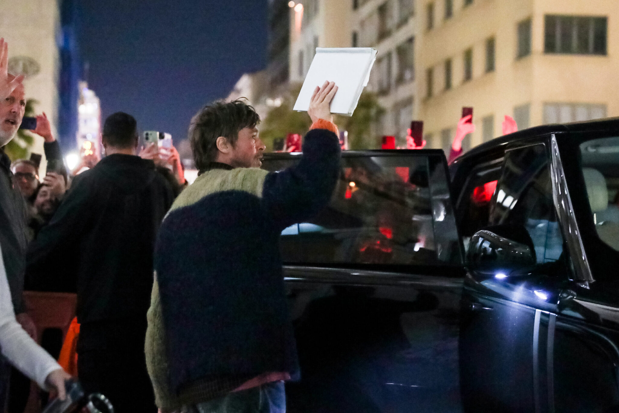 Η υποδοχή του κόσμου ήταν θερμή, με δεκάδες παρευρισκόμενους να φωνάζουν το όνομά του και να κρατούν κινητά τηλέφωνα καταγράφοντας τη στιγμή. Ο Μπραντ Πιτ, παρά την κούραση από τις πολύωρες κινηματογραφικές λήψεις, ανταποκρίθηκε με χαμόγελο, χαιρετώντας τον κόσμο ενώ κρατούσε στο χέρι έναν φάκελο, ο οποίος πιθανότατα περιείχε το σενάριο της ταινίας.