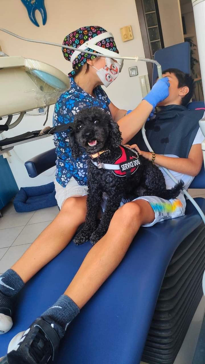 «Όταν ετοιμάσουμε τον ασθενή, δηλαδή αφού καθίσει στην καρέκλα και τοποθετήσουμε το προστατευτικό για τα ρούχα του, τότε η Άριελ πιάνει δουλειά», εξηγεί η χειρουργός οδοντίατρος. Η παρουσία της σκυλίτσας μειώνει το άγχος που προκαλεί ο τροχός, η ένεση και η ίδια η καρέκλα.
