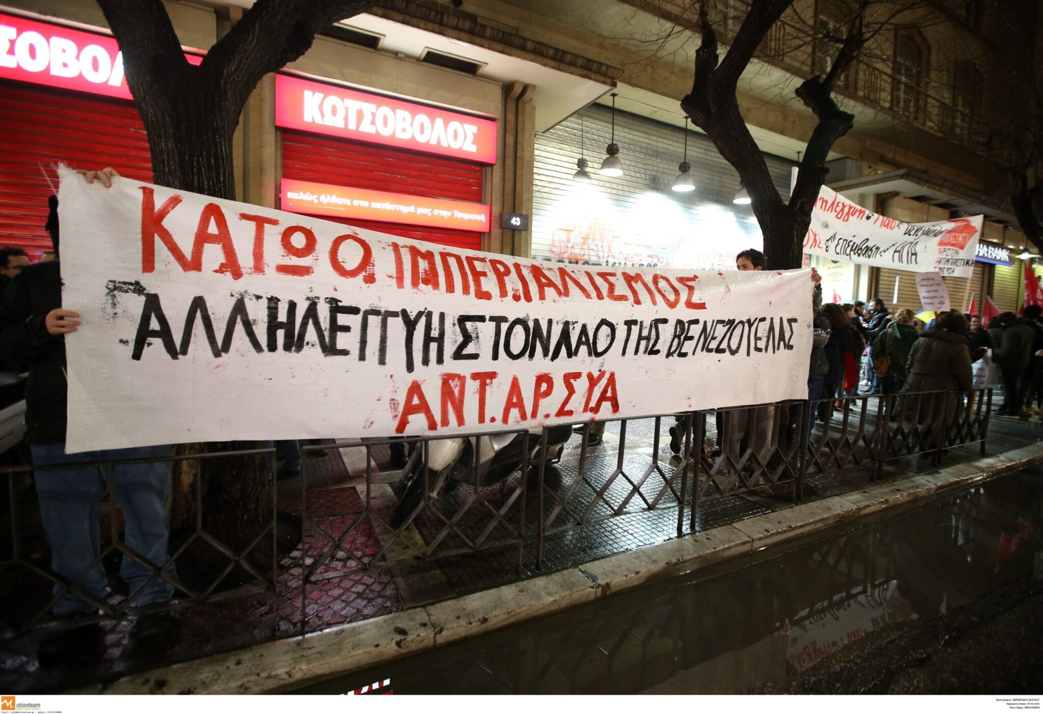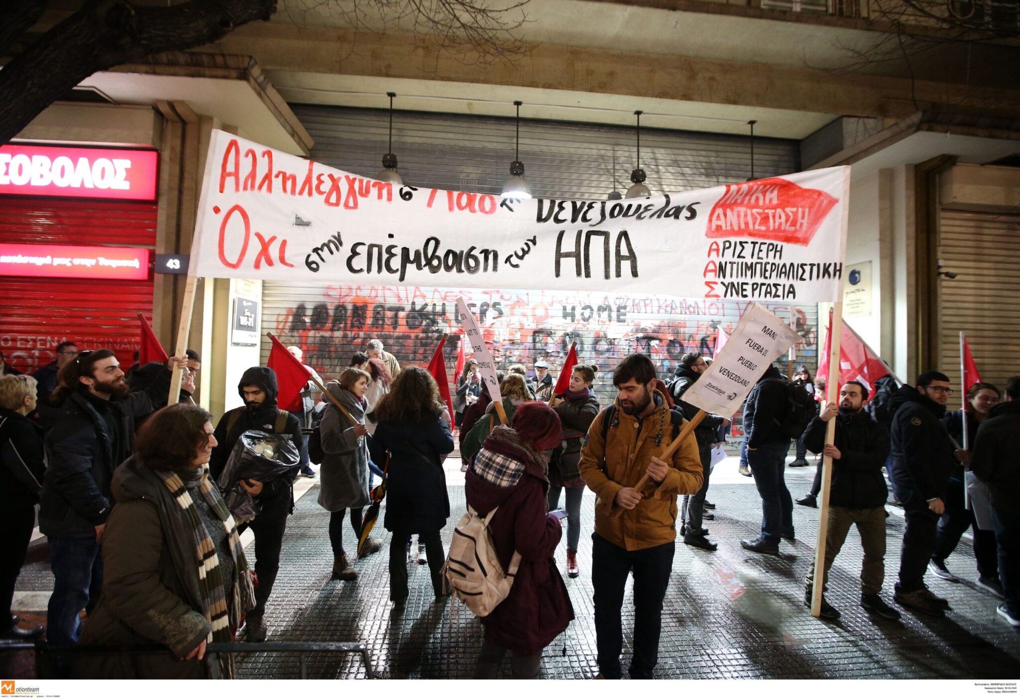 «Αλληλεγγύη στο λαό της Βενεζουέλας. Όχι στην επέμβαση των ΗΠΑ», «Κάτω το πραξικόπημα ΗΠΑ-Αντιδραστικών», «Νίκη στους εργάτες της Βενεζουέλας», έγραφαν τα πανό των διαδηλωτών, οι οποίοι αποχώρησαν χωρίς να κάνουν πορεία.