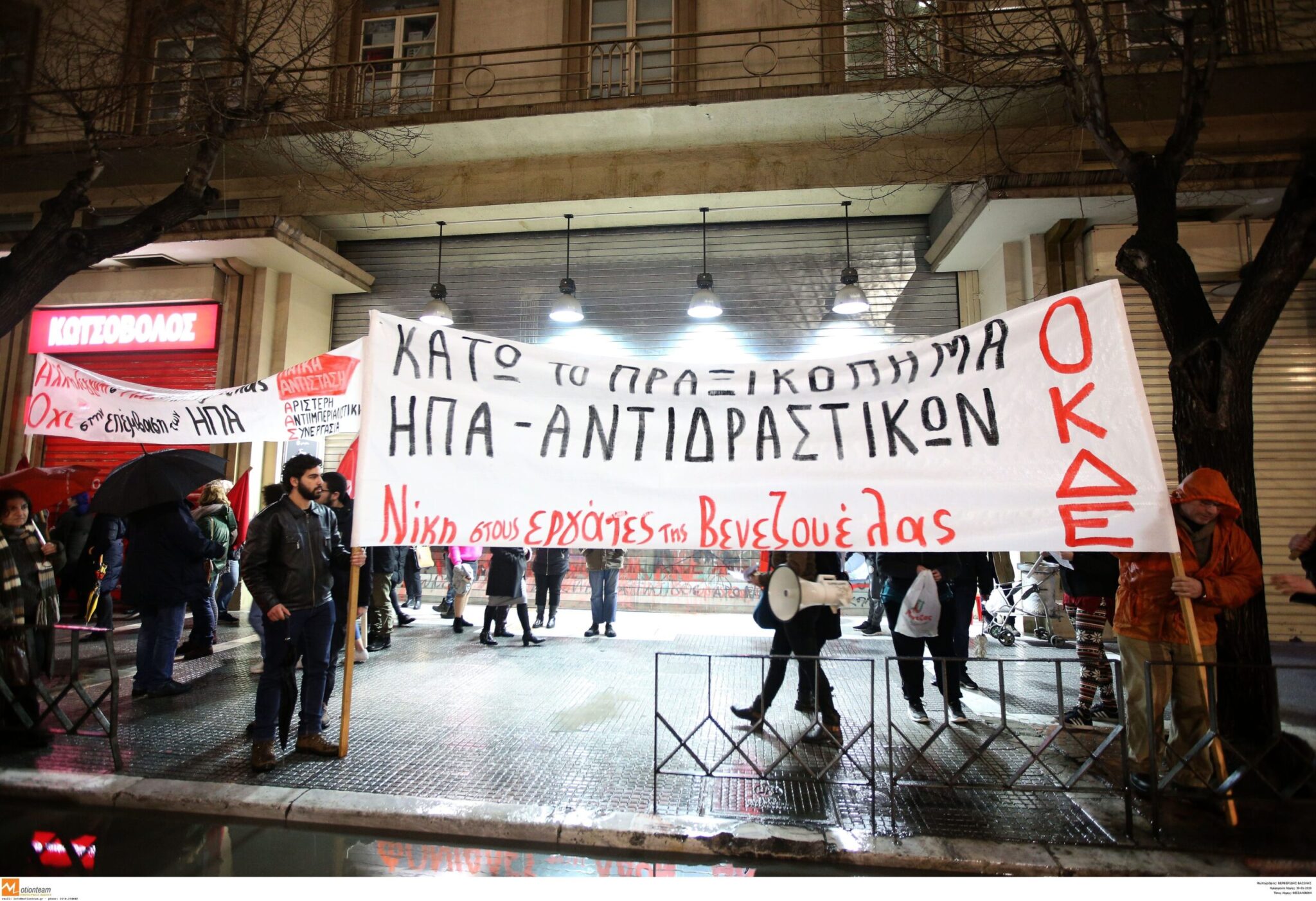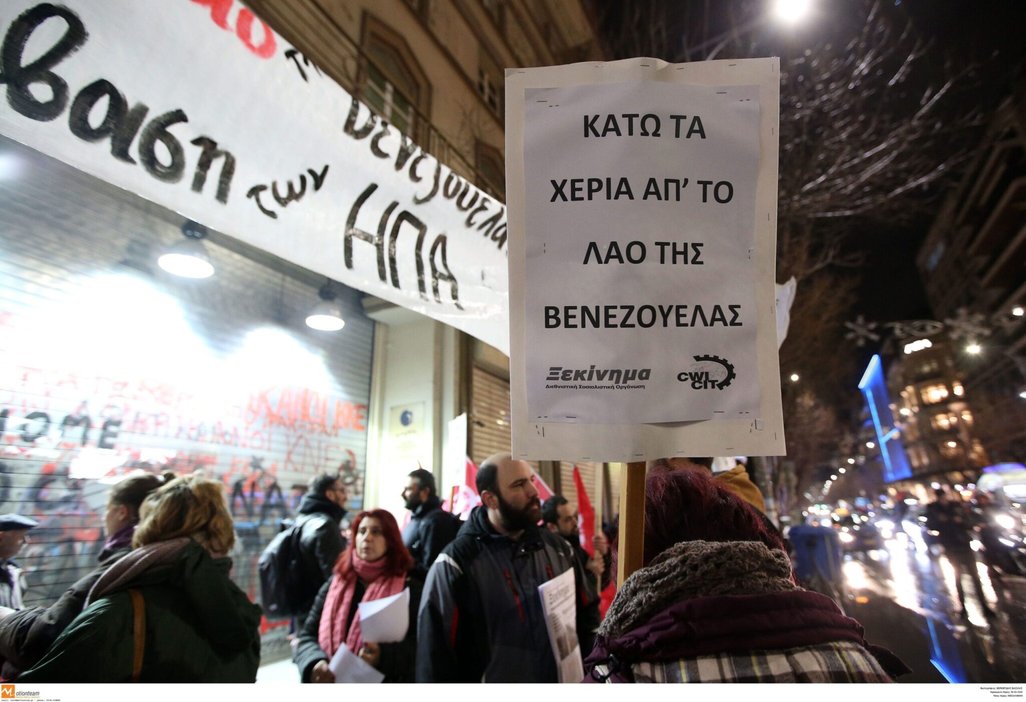 Συγκέντρωση διαμαρτυρίας για την κατάσταση που επικρατεί στη Βενεζουέλα, πραγματοποίησαν στην οδό Τσιμισκή, έξω από το προξενείο των ΗΠΑ στο κέντρο της Θεσσαλονίκης, πολιτικές οργανώσεις και συλλογικότητες της Αριστεράς.