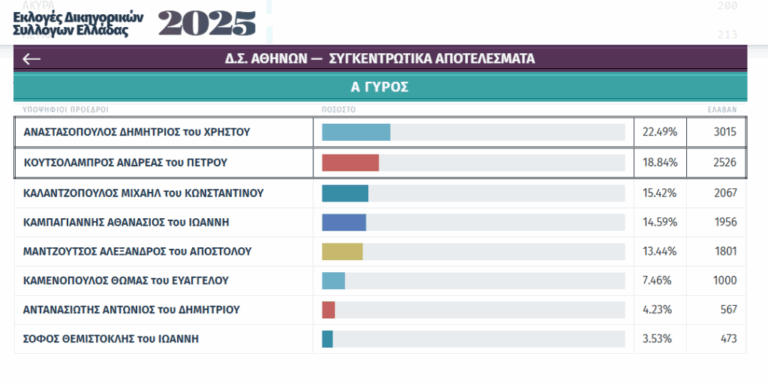 O πρώτος γύρος της κάλπης για τον μεγαλύτερο δικηγορικό σύλλογο της χώρας εξελίχθηκε για… γερά νεύρα καθώς τρεις υποψήφιοι (Μ. Καλαντζόπουλος, Θ. Καμπαγιάννης και Ανδρ. Κουτσόλαμπρος) εναλλάσσονταν για αρκετή ώρα στη δεύτερη θέση.