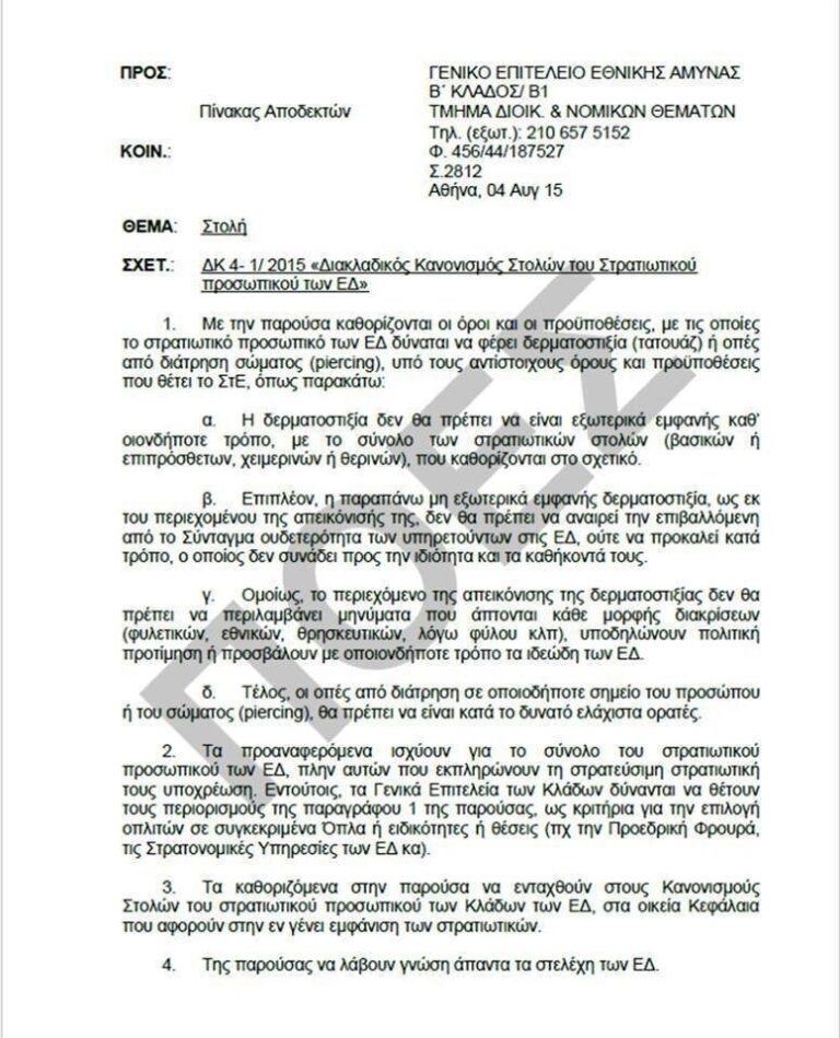Με απόφαση του Γενικού Επιτελείου Εθνικής Άμυνας και τα στελέχη των Ενόπλων Δυνάμεων θα μπορούν πλέον να κάνουν τατουάζ ή piercing, υπό ορισμένες βέβαια προϋποθέσεις και σύμφωνα πάντα με απόφαση του ΣτΕ.
