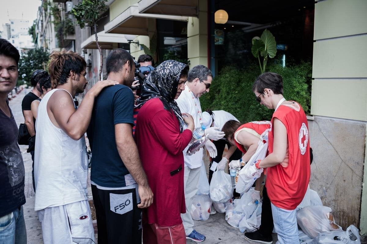 Η ατμόσφαιρα είναι πολύβουη αλλά ήρεμη, ειρηνική και ασφαλής σαν σε πλήρη αντίθεση με τις μνήμες που οι άνθρωποι αυτοί κουβαλάνε εντός τους. Επί της Γ΄ Σεπτεμβρίου δύο περιπολικά της ΕΛ.ΑΣ. είναι σταθμευμένα- η παρουσία των αστυνομικών σαφής αλλά διακριτική. Δυο μέρες πριν ορισμένοι «αγανακτισμένοι κάτοικοι» είχαν πετύχει κάνοντας φασαρία να ακυρώσουν ένα συσσίτιο του Ερυθρού Σταυρού στην πλατεία- την επόμενη το συσσίτιο έγινε κανονικά. Δεν παρατηρώ οτιδήποτε ανάλογο- αντιθέτως. Δύο ηλικιωμένοι συζητούν στο «παγκάκι τους, χρόνια τώρα» με πρόσφυγες- η καλή διάθεση και η νοηματική υπερνικούν το εμπόδιο της γλώσσας.
