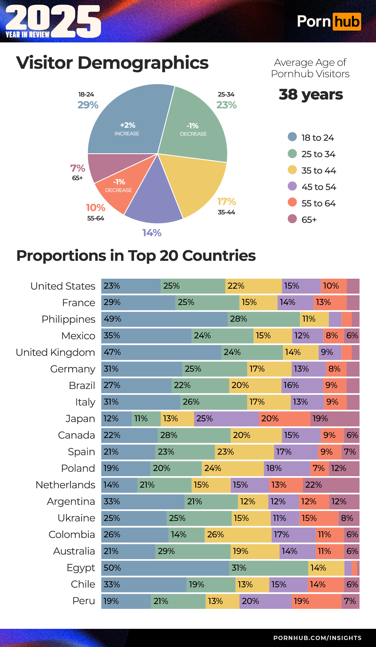Η ηλικιακή ομάδα 18–24 ετών αντιστοιχεί πλέον στο 29% του συνολικού κοινού, παρουσιάζοντας αύξηση κατά 2 ποσοστιαίες μονάδες σε σχέση με πέρυσι. Μαζί με την κατηγορία 25–34, η οποία αντιπροσωπεύει το 23% των επισκεπτών (μείωση κατά 1%), οι δύο ομάδες συγκεντρώνουν πάνω από το μισό της συνολικής κίνησης στο Pornhub.