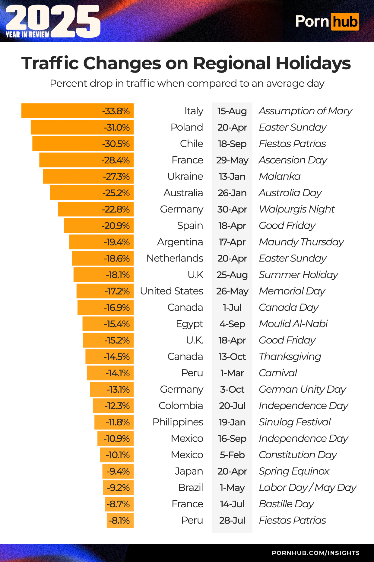 Όσον αφορά την Πρωτοχρονιά, το Pornhub χαρακτηρίζει τη μείωση αναμενόμενη: από το απόγευμα της 31ης Δεκεμβρίου η κίνηση μειώνεται σημαντικά, με την Κολομβία να καταγράφει πτώση 65%, τις Φιλιππίνες 61% και τη Χιλή 60%. Αντίθετα, η Αίγυπτος παρουσίασε μόλις 11% μείωση, κάτι που αποδίδεται στο ότι η χώρα είναι κατά πλειονότητα μουσουλμανική και το αντίστοιχο νέο έτος γιορτάζεται σε διαφορετική ημερομηνία.